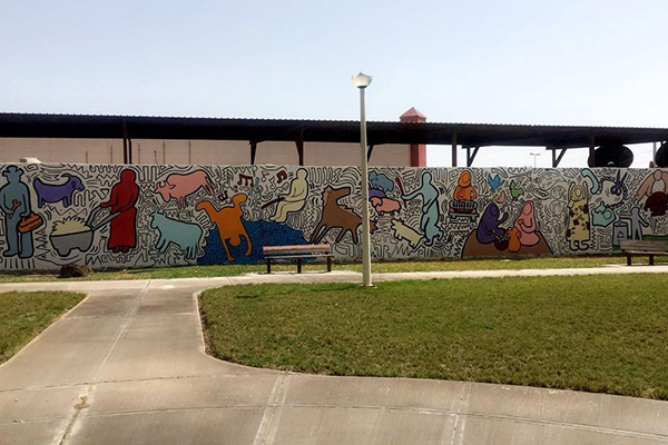 واختصرت الجدارية التي تشارك فيه ثمان تشكيليات بعض المواقف العائلية والحياة الحديثة، الزمن القديم وبعض السلوكيات الجيد منها وربما الغير محبذ مثل المرأه ناقلة الاخبار.