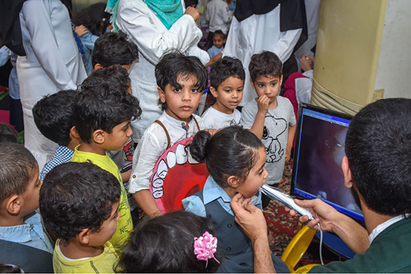 كما تضمنت تنوعا جذابا بوجود أركان صحية تثقيفية وترفيهية تشمل عددا من الأركان منهم الفحص بالكاميرا الفموية، التي تهدف لكشف وتوضيح حالة الأسنان من تسوس والتهاب اللثة وتراكم الجير، والتعرف على الطريقة الصحيحة لتنظيف الأسنان.