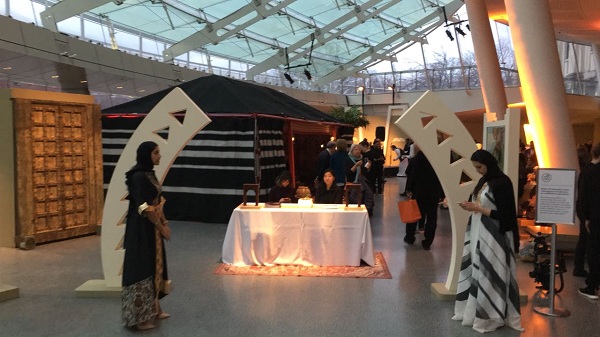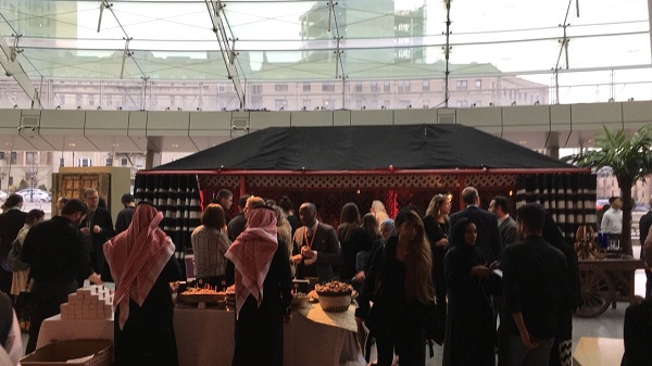 وقُدم في هذا المحفل وعلى وتر العود الأصيل أطعمة بالمذاق السعودي الفريد من طباخين سعوديين وأصناف التمور والقهوة للزوار وتشكيلات من الحناء للزائرات وجولات حرفية فنية من حرفيين متميزين منهم الخطاط الأنصاري الذي رسم روائع الخط العربي بأسلوب فني والفنانه المبتعثة مشاعل الدوسري التي شكلت لوحات فنية من تراث الخط الجنوبي العسيري أمام الزوار مباشرة لاقت استحسانهم وانبهارهم بالتراث السعودي.