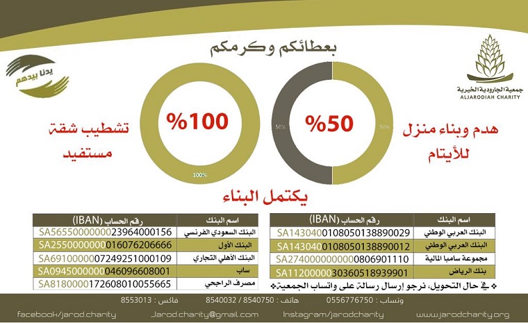 «خيرية الجارودية» تهيب أصحاب اليد البيضاء لإكمال بناء منزل للأيتام