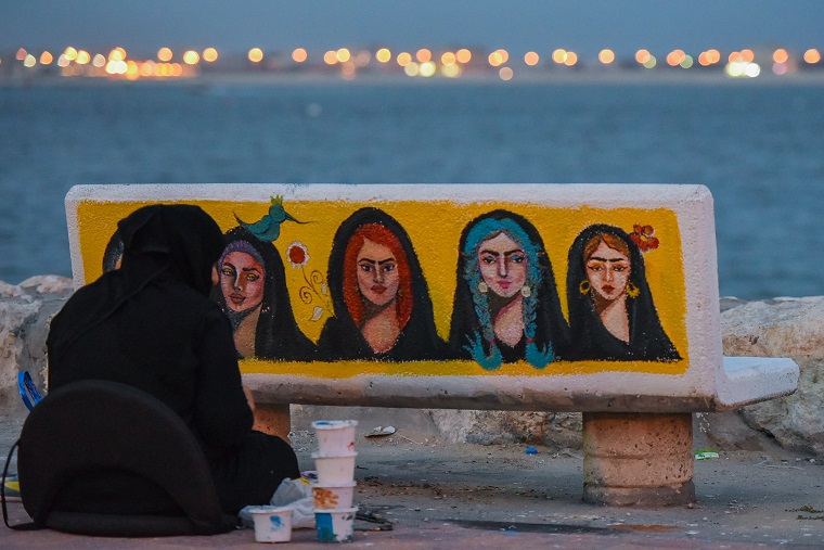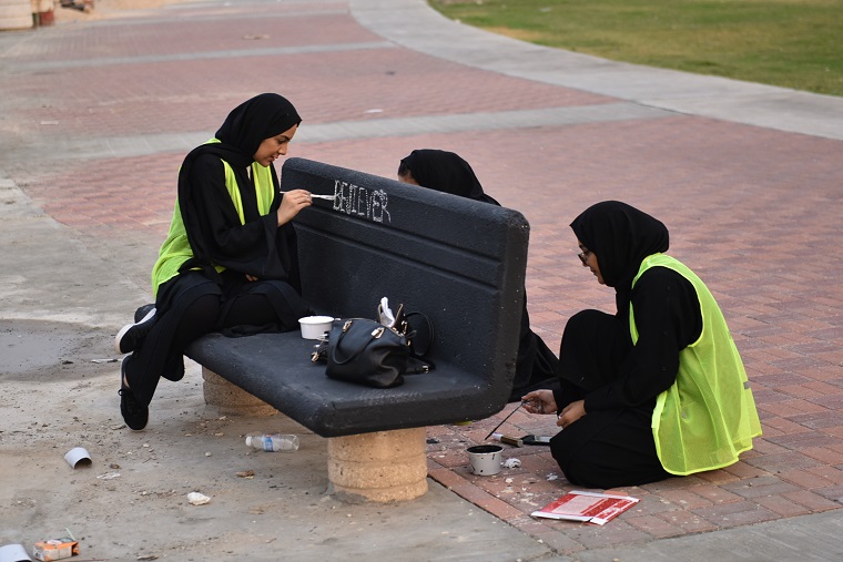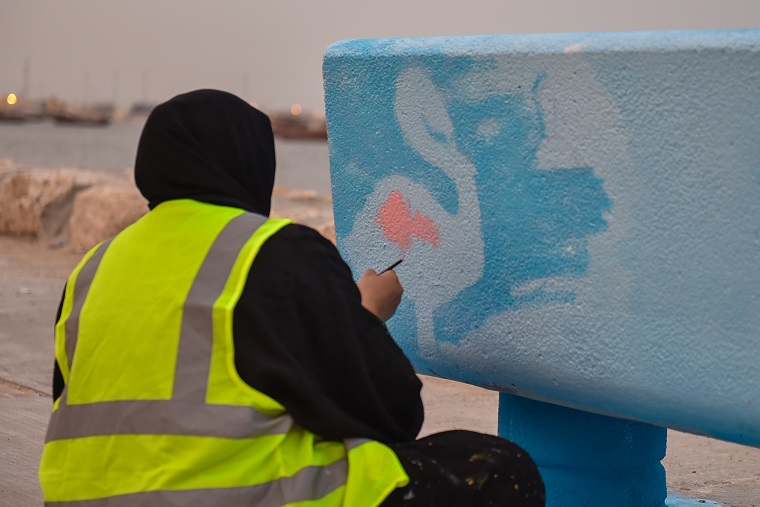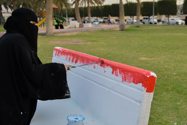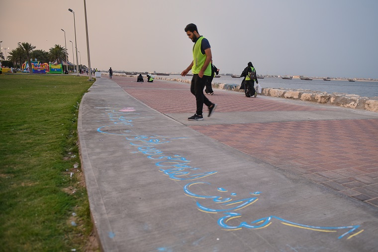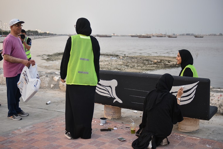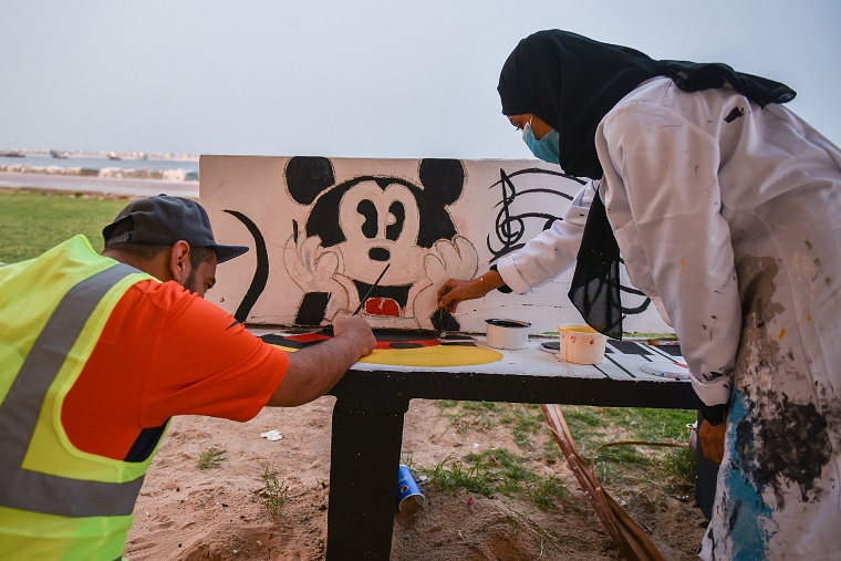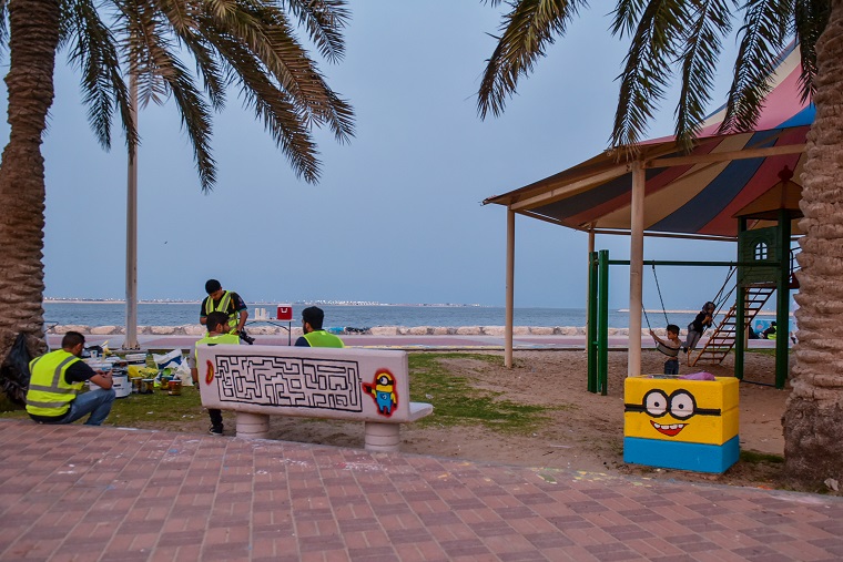 نقش 40 هاوٍ للفن التشكيلي والخط العربي أفكارهم الفنية على أرصفة وكراسي ودورات المياه في كورنيش القطيف، وحولوها للوحات جمالية حباً في الوطن.