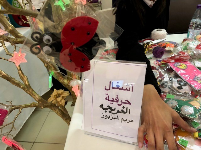 وقالت الطالبة درة الناصر انها تشجع نفسها لتنفيذ الأشغال اليدوية وبكلات الشعر وتعرضها للبيع كمشروع خاص بها.