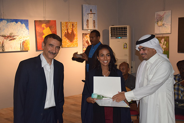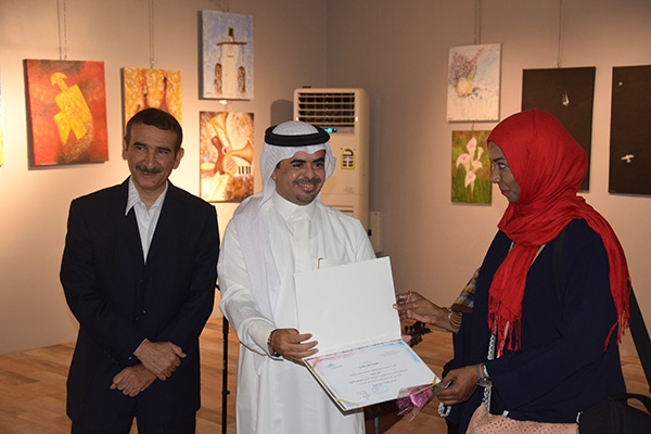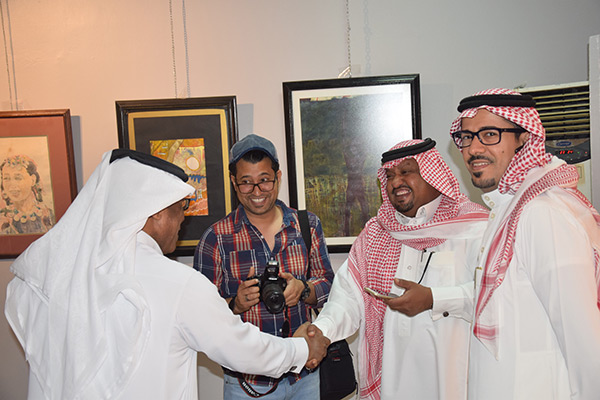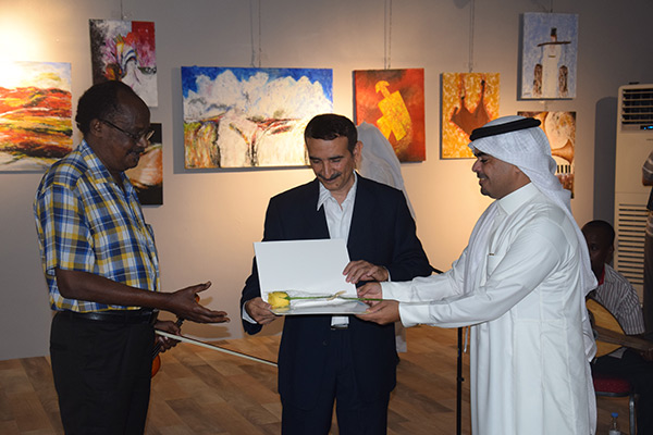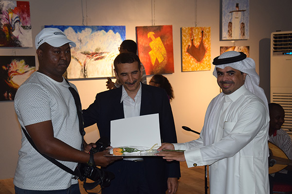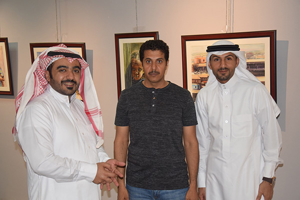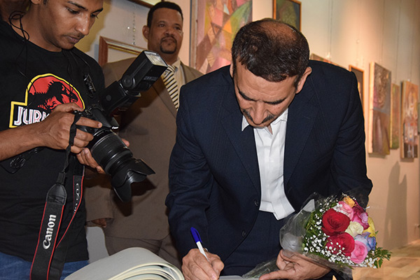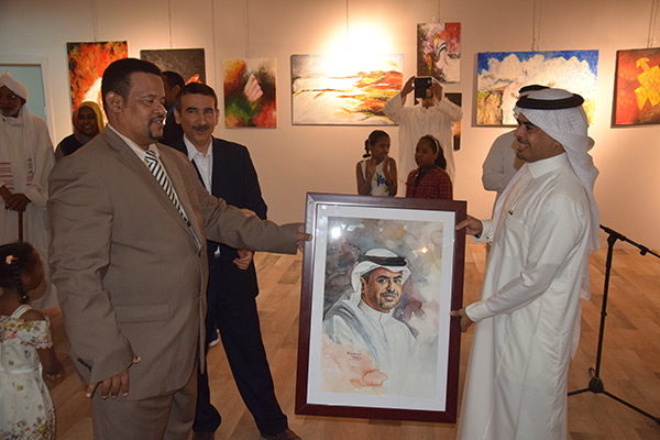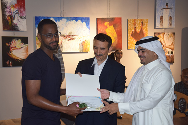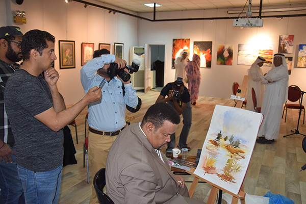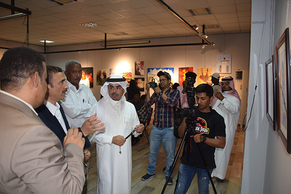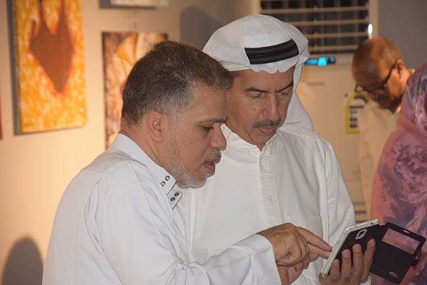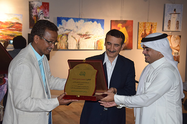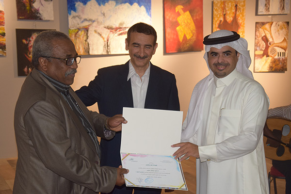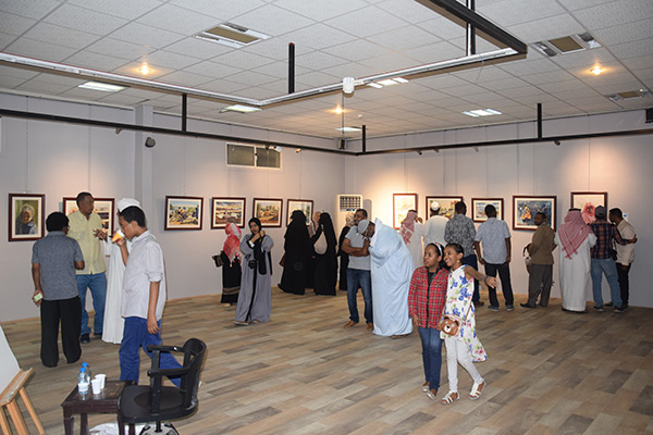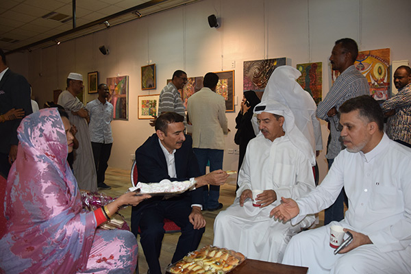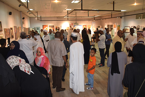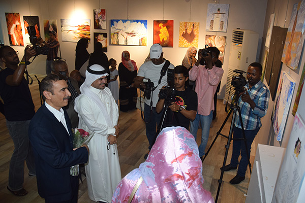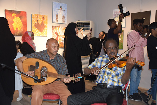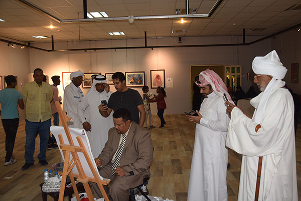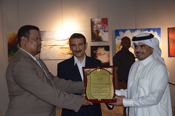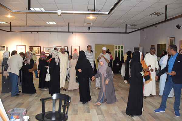 وضمت الاحتفالية عزف وغناء رافق المعرض، وألقيت كلمات الترحيب بالحضور واحتفاء بالفنانين الثلاثة «محمد حسن، وعبدالرحمن التكينة، وآمال حمودي» الذين قدموا الاعمال الفنية بين الاحجام المتوسطة والكبيرة استخدم فيها الاحبار والالوان الاكليريك والمائي.