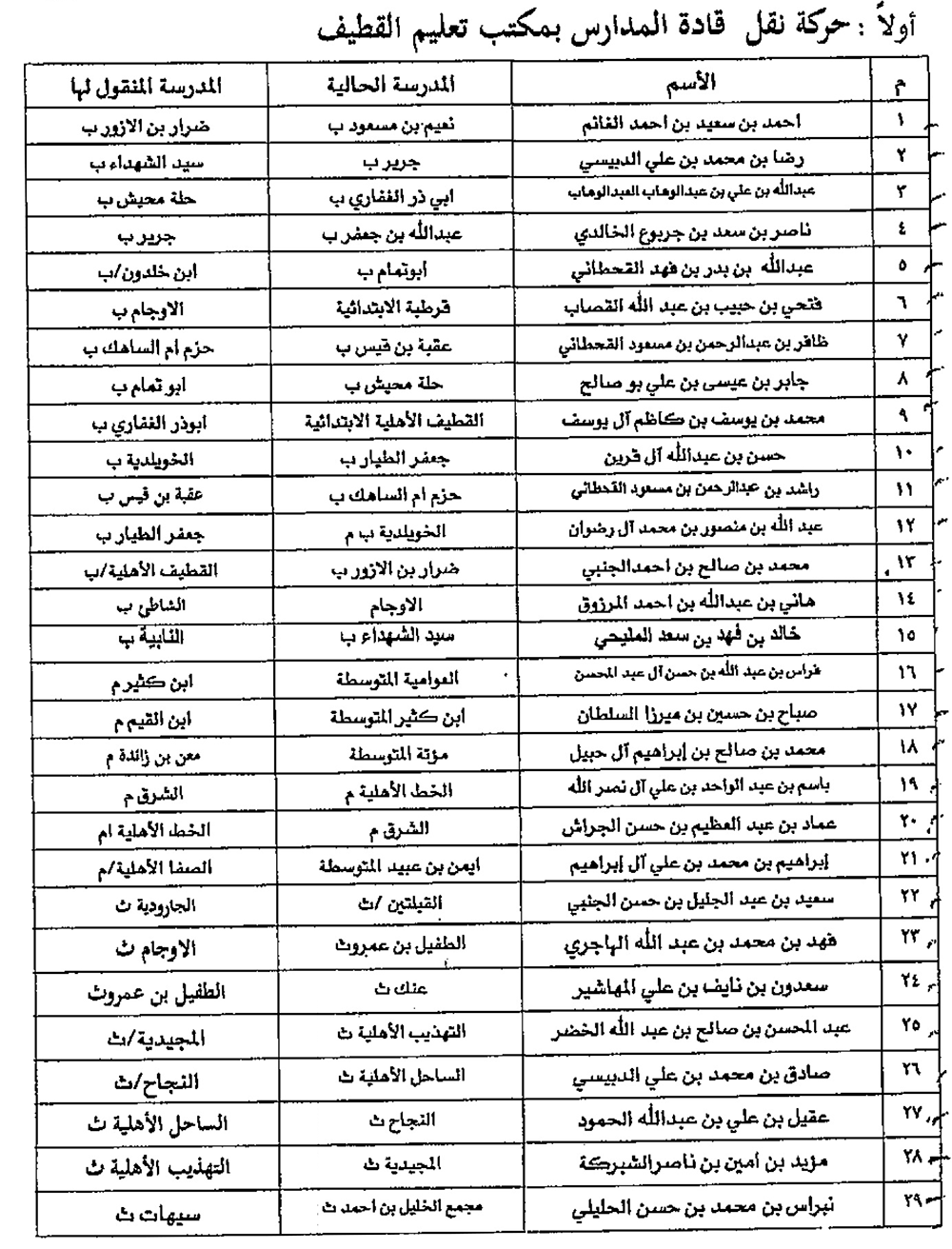 بالاسماء.. تعليم القطيف يصدر قرار بنقل 29 قائدا تربويا