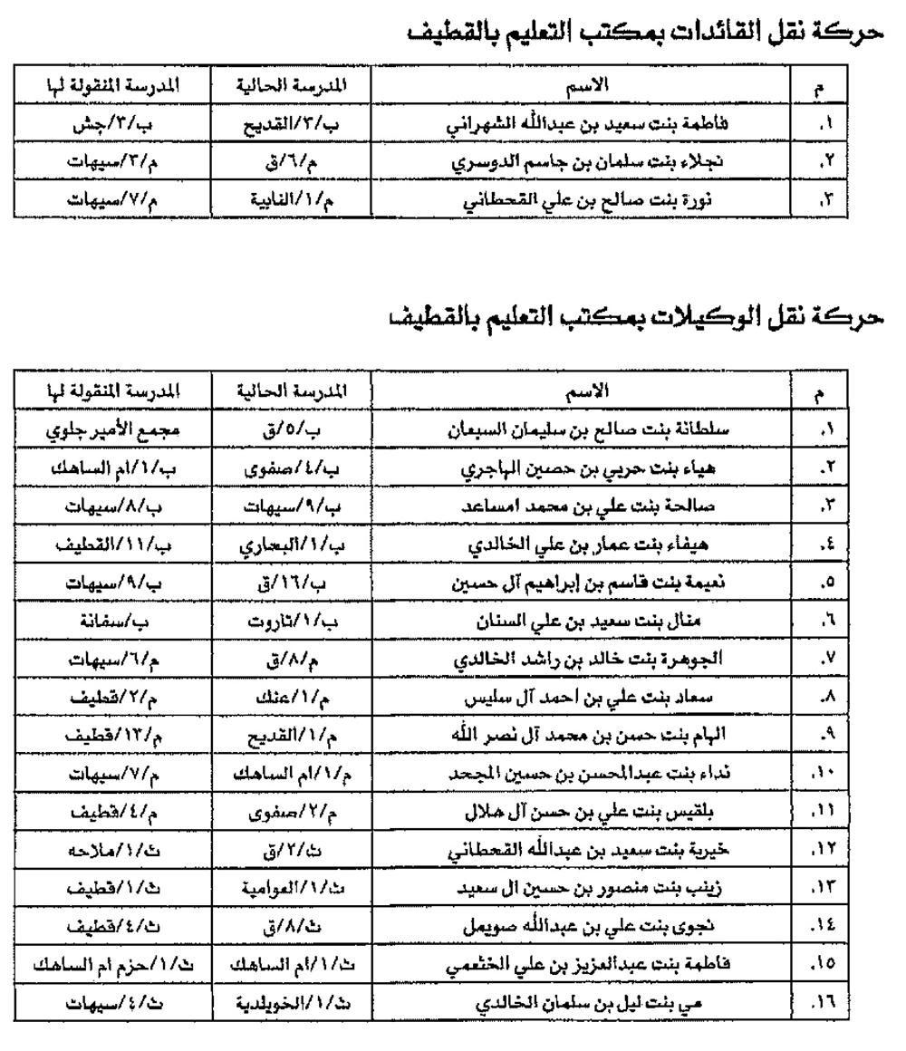وشملت حركة النقل قادة المدارس، وكلاء المدارس، القائدات بمكتب التعليم، الوكيلات بمكتب التعليم.
