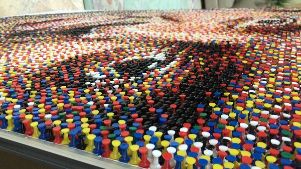 وبين انه استخدم الدبابيس السوداء والبيضاء والخضراء والحمراء والزرقاء الصفراء في صنع اللوحة؛ منوها إلى أن هذا الفن يختص برؤيته واقعيا من بعيد ولكن عند الإقتراب من العمل الفني يرى بشكل منقط.