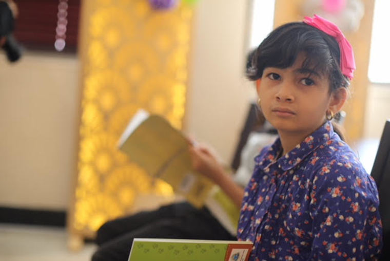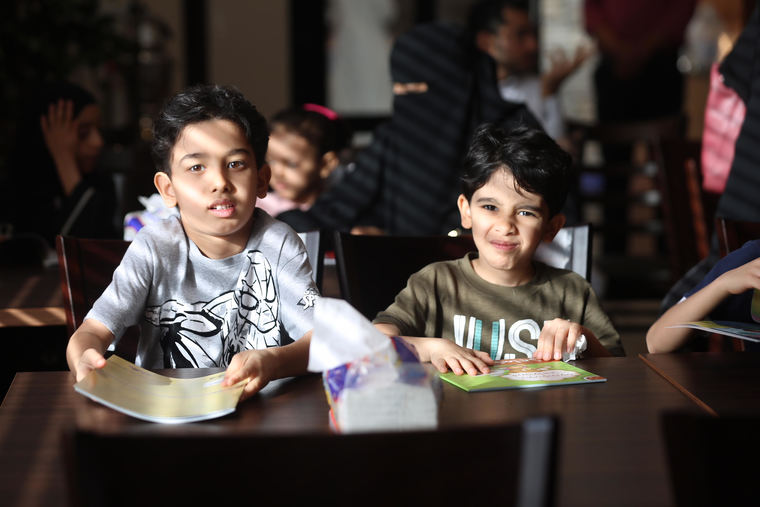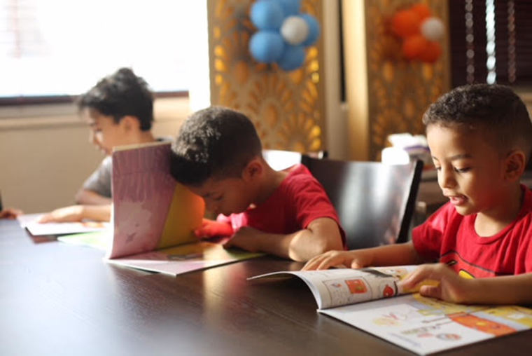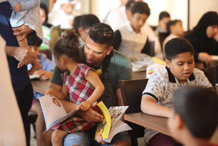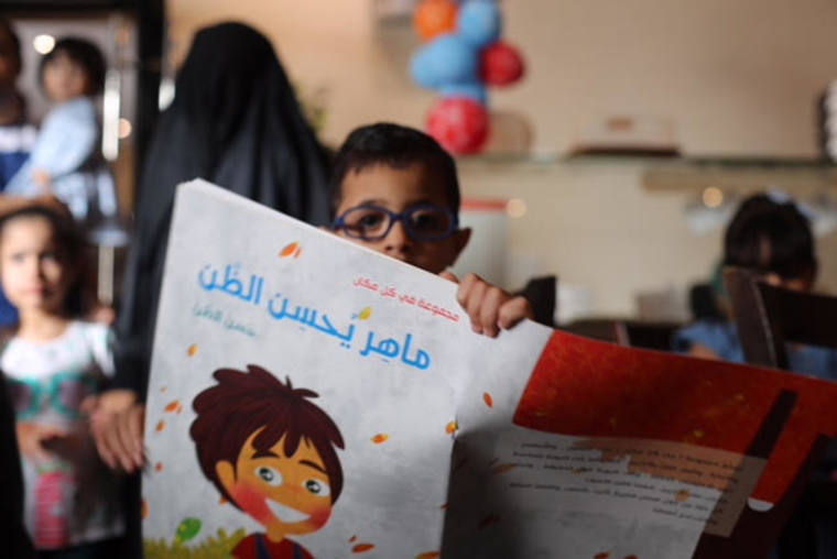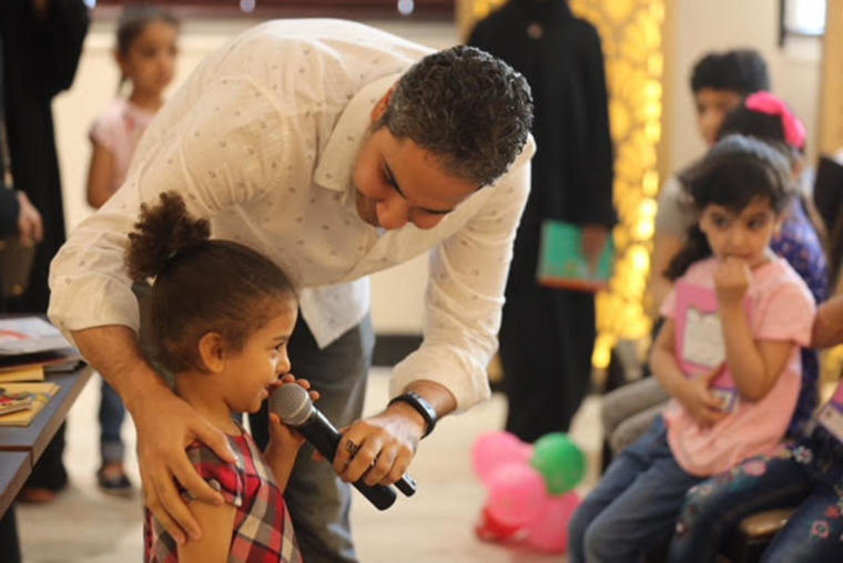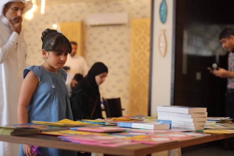 واستحوذ الأطفال على 200 كتاب تخاطب الطفل من سن 5 - 14 عاما تم توزيعها يوم أمس في قاعة أحد المطاعم .