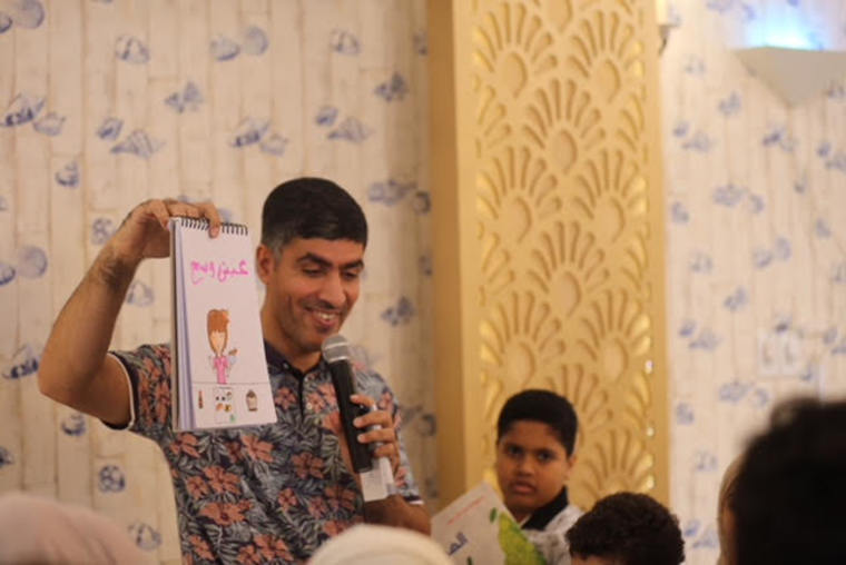 وتضمن اللقاء على كلمة للكاتب عبد الإله التاروتي حث فيها على القراءة والاهتمام بالكتابة، موجها رسالته للآباء في تعويد الطفل على القراءة منذ الصغر.
