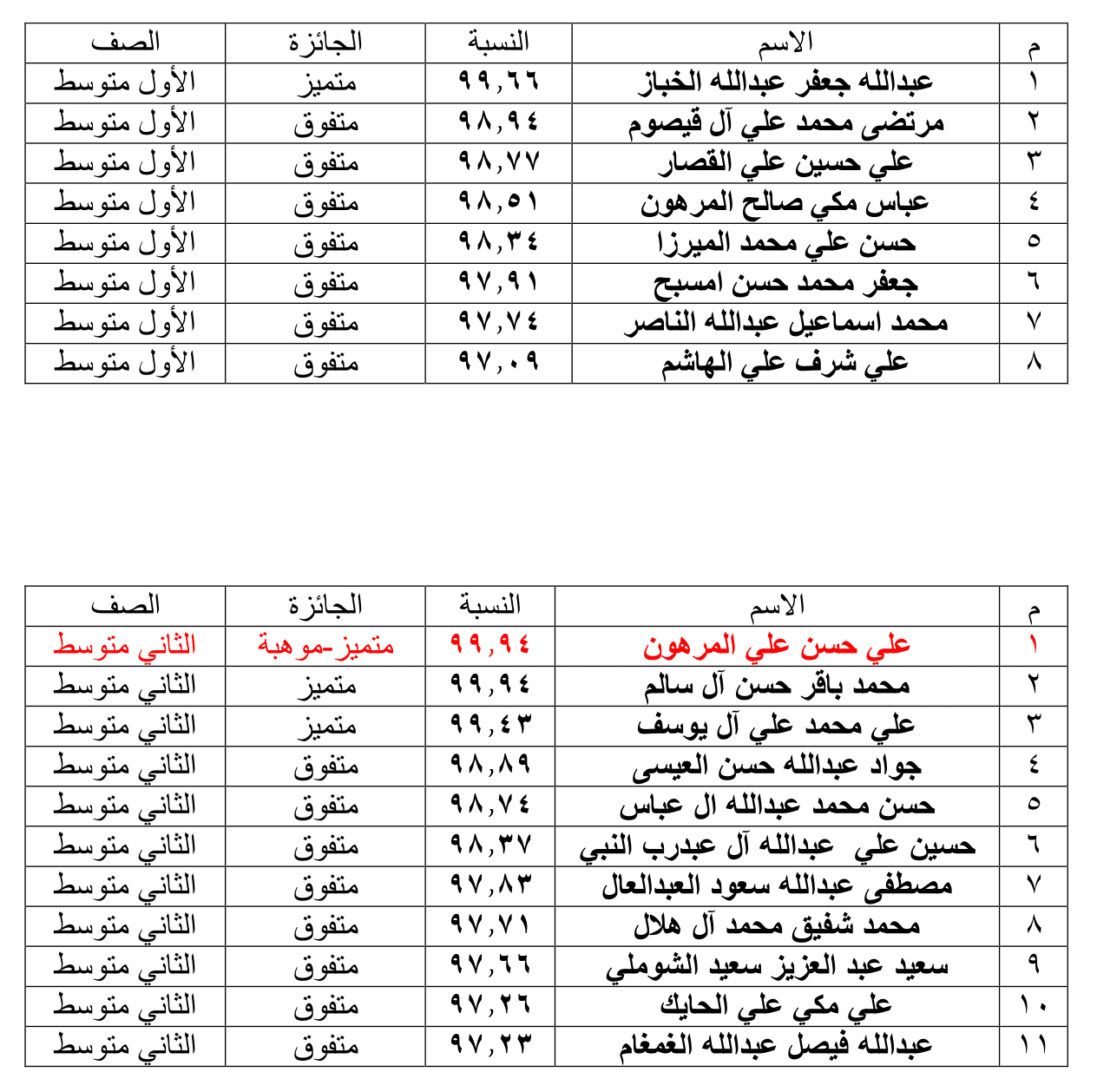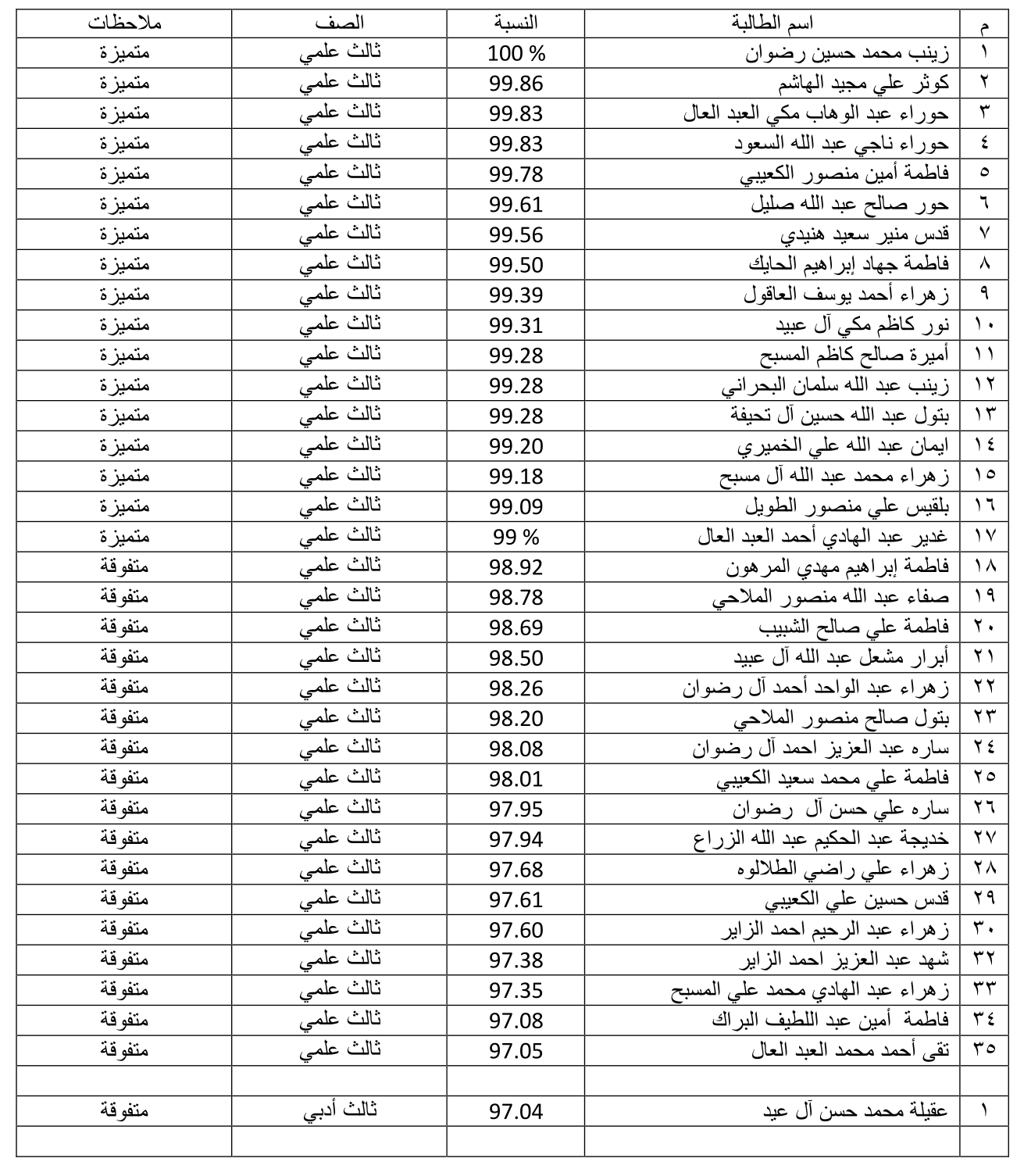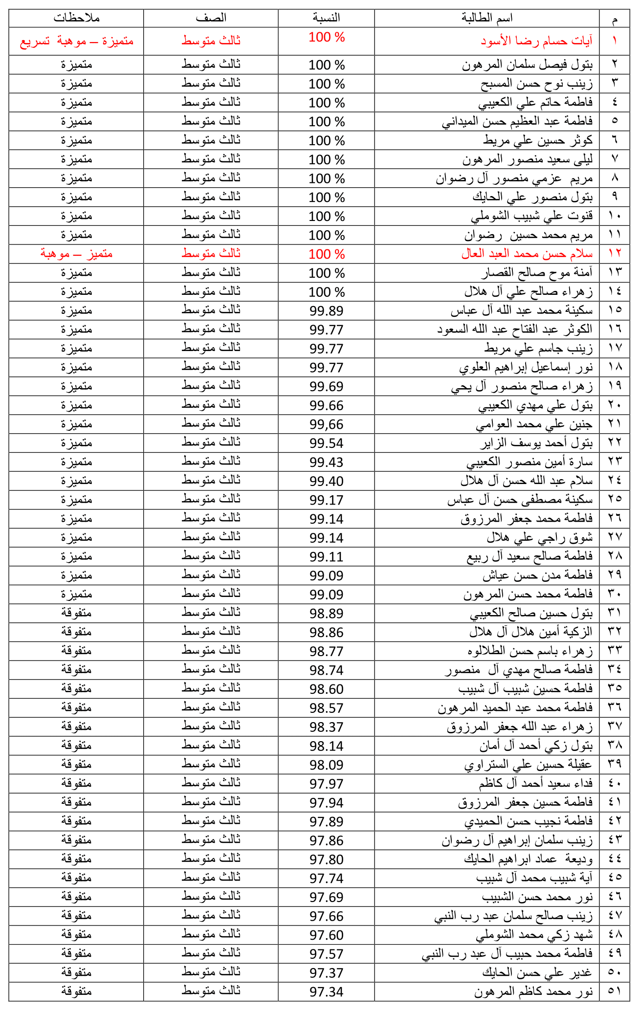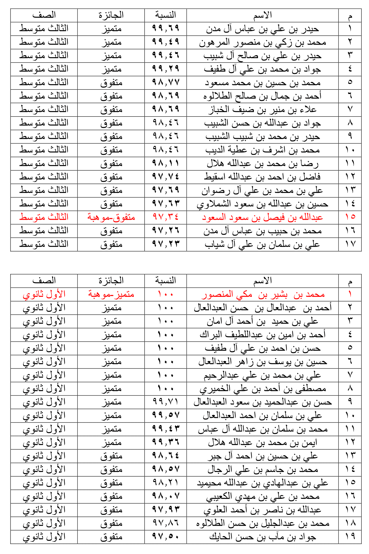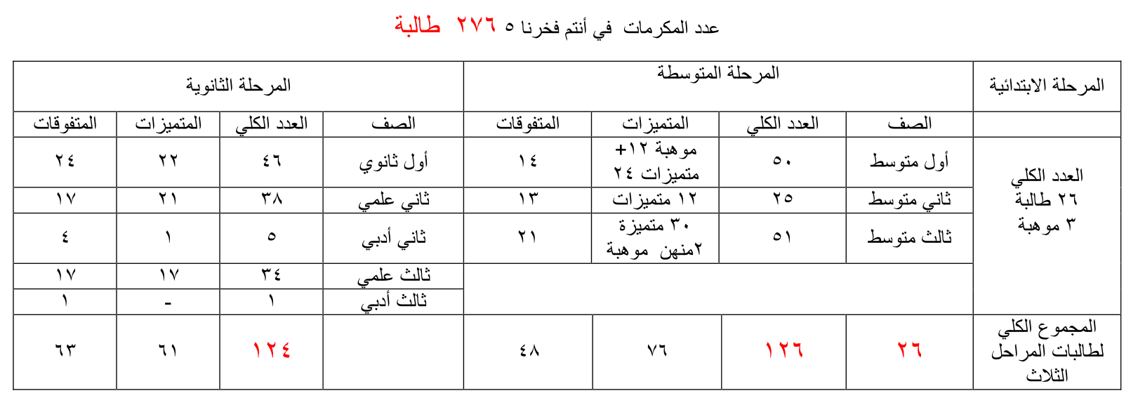 حقق 385 طالب وطالبة من أبناء بلدة أم الحمام نسبة أعلى من 97% للمعدل التراكمي واستحقوا بذلك جائزة التفوق الدراسي بأم الحمام، إنجازاً لمعايير الجائزة التي تم رفعها هذا العام.