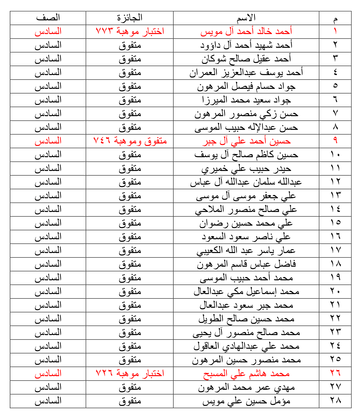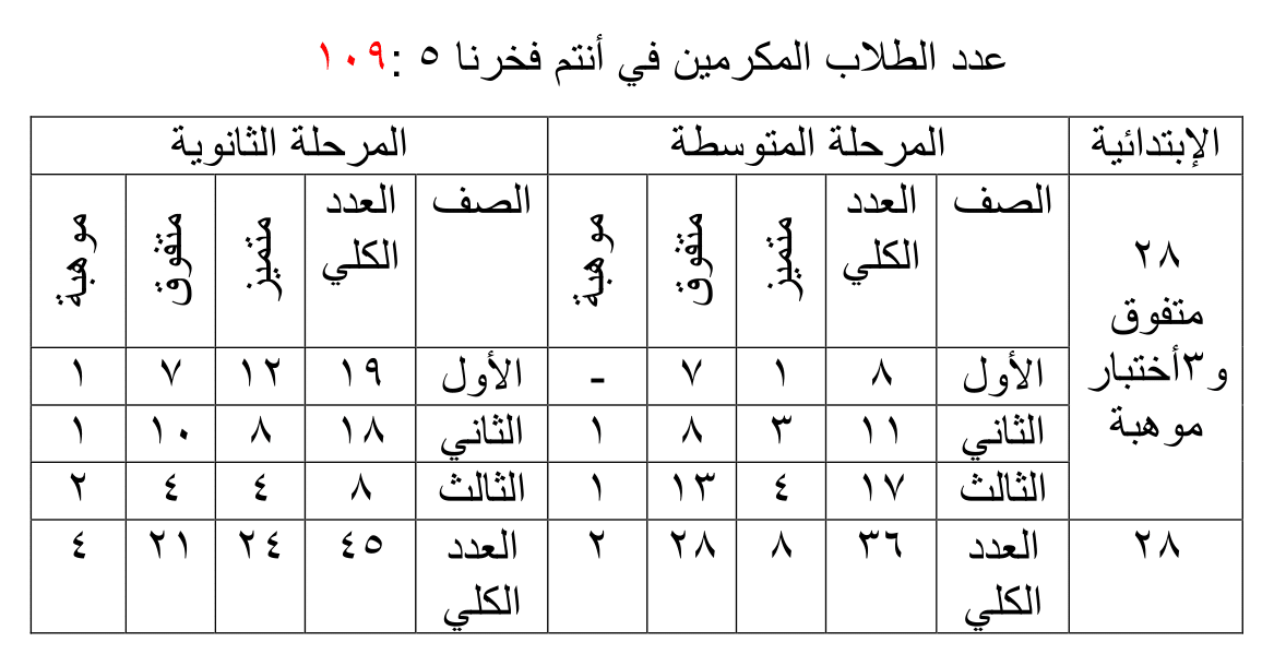 إذ أعلنت لجنة جائزة التفوق الدراسي التابعة لجمعية أم الحمام الخيرية اعتمادها نتائج 109 متفوق و276 متفوقة من الذين ترشحوا للجائزة والمعتزم تكريمهم في نسختها الخامسة من حفل ”أنتم فخرنا 5“، من مرحلة التعليم العام من أبناء بلدة أم الحمام لعام 1439.