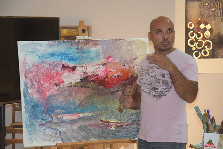 واستعرض أنواع الفرش واستخداماتها وتأثير كل منها في اللوحة، لافتا إلى صعوبة الإعتماد على فرشاة واحدة، لكامل العمل.