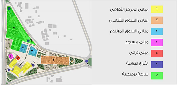 ولفت إلى وجود مباني المركز الثقافي ومباني السوق الشعبي ومباني السوق المفتوح ومبنى المسجد ومبنى تراثي والأبراج التراثية وساحة ترفيهية.