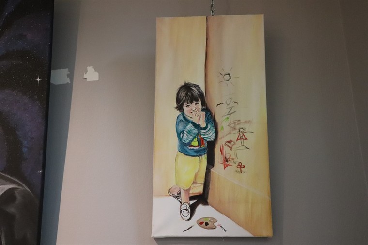 ومن جانب آخر، أشارت إلى وحدة الطفلة في لوحة أخرى وافتقادها للجو الدافىء، وأمنياتها بحياة طبيعية في حضن العائلة، مشيرة إلى ان وحدتها قد ترمز لليتم أوالتشرّد أو الطفل المعنّف في أي مكان في العالم.