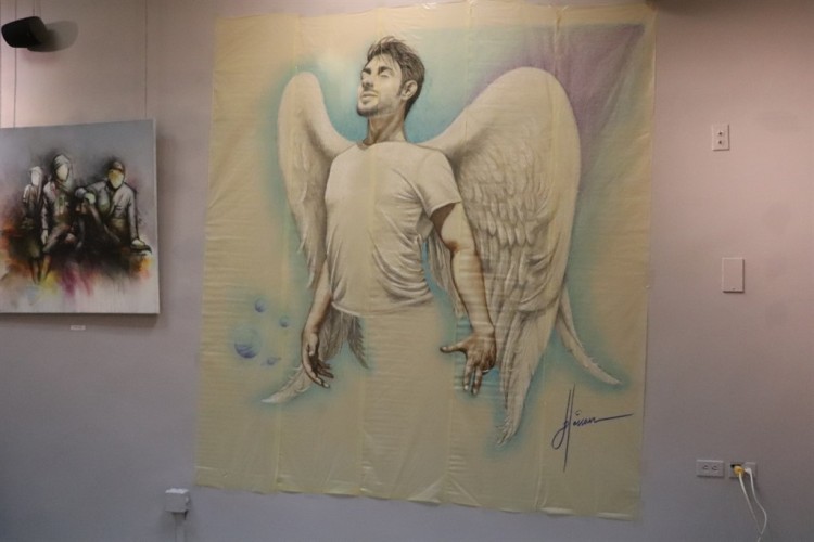 جذبت لوحة من الحجم الكبير وبدون إطار لرجل ذو أجنحة زوار معرض ”فن يحكى“ للفنان حسن المؤمن، في قاعة عبدالله الشيخ في جمعية الثقافة والفنون بالدمام، بعد إضافتها للمعرض أمس الذي افتتح قبل يومين.
