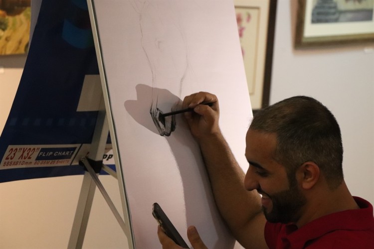 وذكر أنها المشاركة الأولى له في المعارض الفنية، فعادة ما يكتفي بالرسم والنشر في حسابه على ”الإنستغرام“، إلا ان عمه المدير التنفيذي لمجموعة ”فن يحكى“ محمد المؤمن، والتي انضم لها مؤخرا بطلب من مديرها منصور علي وآخرين، ألحّ عليه بالمشاركة، ولم يوافقه على طلبه إلا بعد بدء المعرض بيومين.