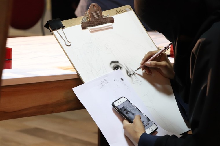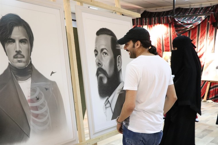 وشاركت الفنانة عاتقة الخويلدي بالرسم المباشر ليلة أمس من الفحم في فن البورتريه والذي تفضله ”لإظهاره واقعية اللون“، مشيرة الى مشاركتها في المعرض بثلاث لوحات اثنتان في الفن البورتريه ”أحدها لأمرأة مسنة لاتزال تهتم بنفسها، والثانية لرجل حزين تبقيه القوة محتملا لنكبات الزمن“، والثالثة بألوان الرش الجريئة للفنانة بثينة الرئيسي لما فيها من ”الحيوية وخفة الظل“.