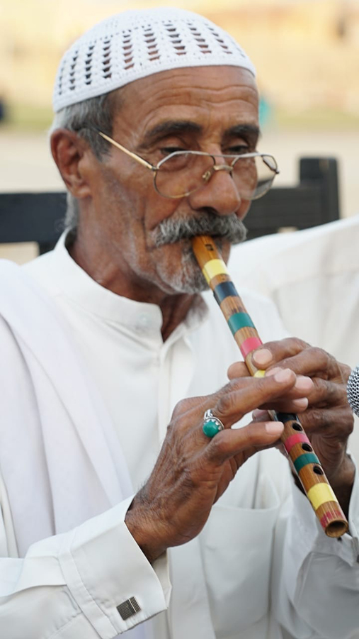 وتوافد الزوار على المقهى للاستماع إلى الأحاديث والقصص القديمة عن العيد، والأهازيج الشعبية وكذلك معزوفات عبر آلة ”الناي“ قدمها أبو نهار، أحد أبناء بلدة سنابس.