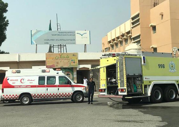 ونجحت قائدة ومعلمات المدرسة في إخلاء 490 طالبة إلى منطقة إخلاء آمنة دون وقوع إصابات، وذلك نتيجة حريق اندلع بمكيف بأحد الفصول الدراسية اثناء تواجد الطالبات للفسحة بفناء المدرسة وعلى الفور تم إغلاق التيار الكهربائي الرئيسي منعا لامتداد النار وإبلاغ الدفاع المدني.