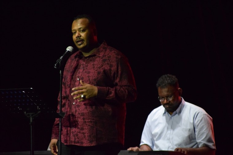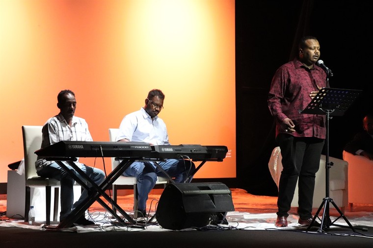 وتفاعل الحضور مع الأغاني التي قدمها يوسف نور بمرافقة الفرقة الموسيقية ومنها أغنية ”أمة للمجد“ و”أعلى الجمال“.