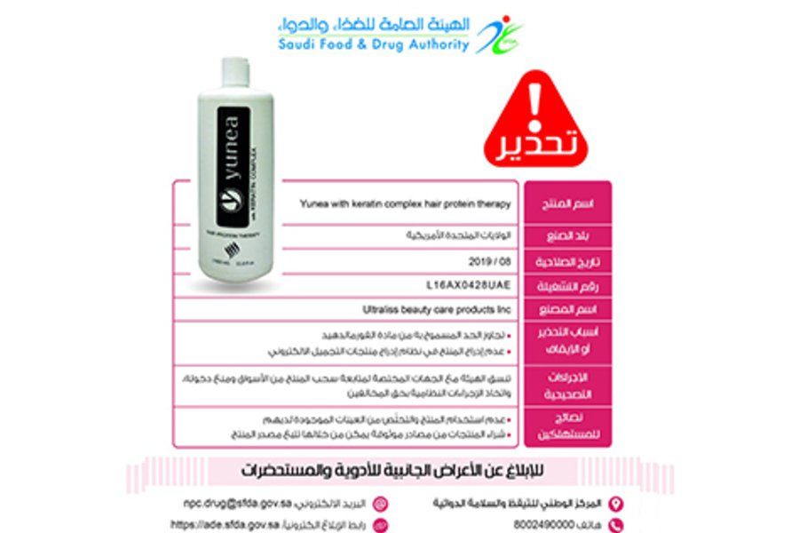 ويحمل المنتج الأول اسم Yunea with keratin complex hair protein therapy، وصُنع في الولايات المتحدة الأمريكية برقم تشغيلة L16AX0428UAE وتاريخ صلاحيته 08/2019.