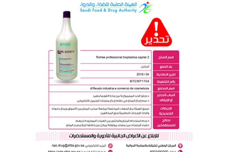أما المنتج الثاني فهو Richee professional bioplastica capilar 2، وصُنع في البرازيل برقم تشغيلة BTCRP1704، وتاريخ صلاحيته 04/2019.