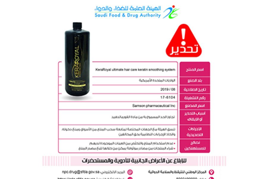 وأوضحت الهيئة أنها جمعت وحللت عينات من منتجات فرد الشعر المتداولة بالأسواق المحلية؛ للتأكد من سلامتها. وأظهرت نتائج التحليل احتواء 4 منتجات على نسبة عالية من مادة ”فورمالدهيد“ التي تسبب مخاطر صحية للمستهلك إذا تجاوزت الحدود المسموح بها في متطلبات السلامة بمستحضرات التجميل والعناية الشخصية رقم SFDA. CO/GSO 1943:2016.