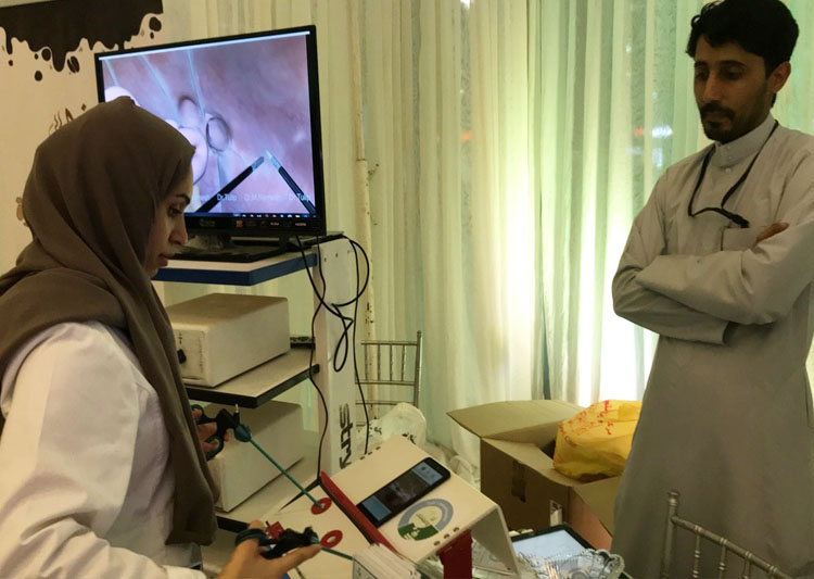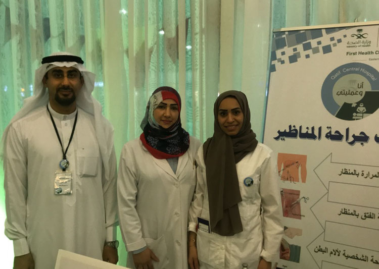 ومن جهة أخرى، عرض هاني الناصر الذي يعمل في قسم الجراحة العامة في مستشفى القطيف المركزي، مجسما صنعه بنفسه ليوضح كيفية إجراء جراحة المناظير واختلافها عن الجراحة التقليدية التي تُجرى بعد إحداث جرح كبير في جسم المريض، بخلاف المنظاير التي تُجرى بإحداث ثقبين صغيرين فقط تدخل الأدوات من خلالهما.