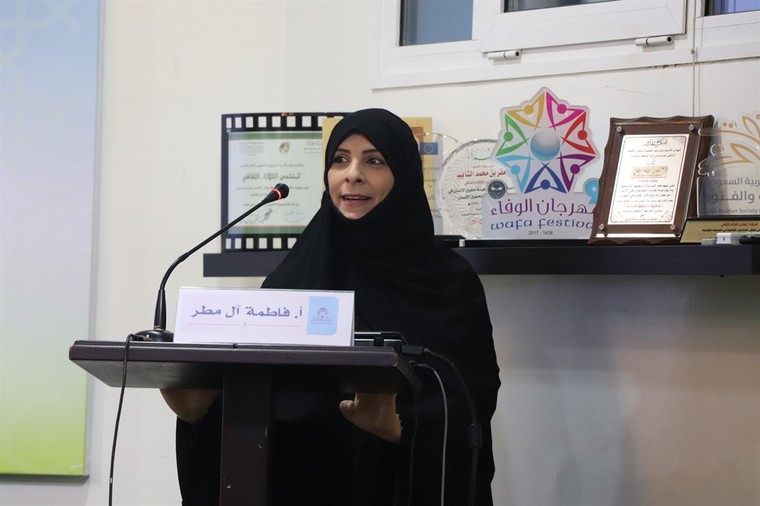 وشملت الأمسية معرضا تشكيليا للفنانة فاطمة المطر والتي تحدثت عن جانب من تجربتها الفنية، وشاهد الحضور فيلما تثقيفياً حول أهمية العناية بالموروث الشعبي وتناقله بين الأجيال.