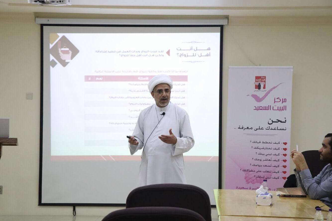 دعا رئيس مركز البيت السعيد بصفوى الشيخ صالح آل ابراهيم إلى تكوين صورة واضحة عن الزواج قبل الإقدام عليه، في الدورة التدريبية ”التأسيس لزواج أكثر سعادة“ التي اقيمت مساء الثلاثاء في مقر المركز .
