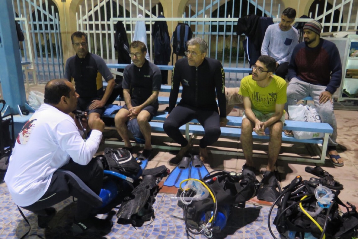 واشتمل اليوم الأول على القسم النظري الذي أقيم في قاعة التدريب بنادي الحي، تعرف المتقاعدون خلاله على طريقة النزول والصعود والسباحة والتنفس في الأعماق، وعوامل الأمن والسلامة ومعدات الغوص.