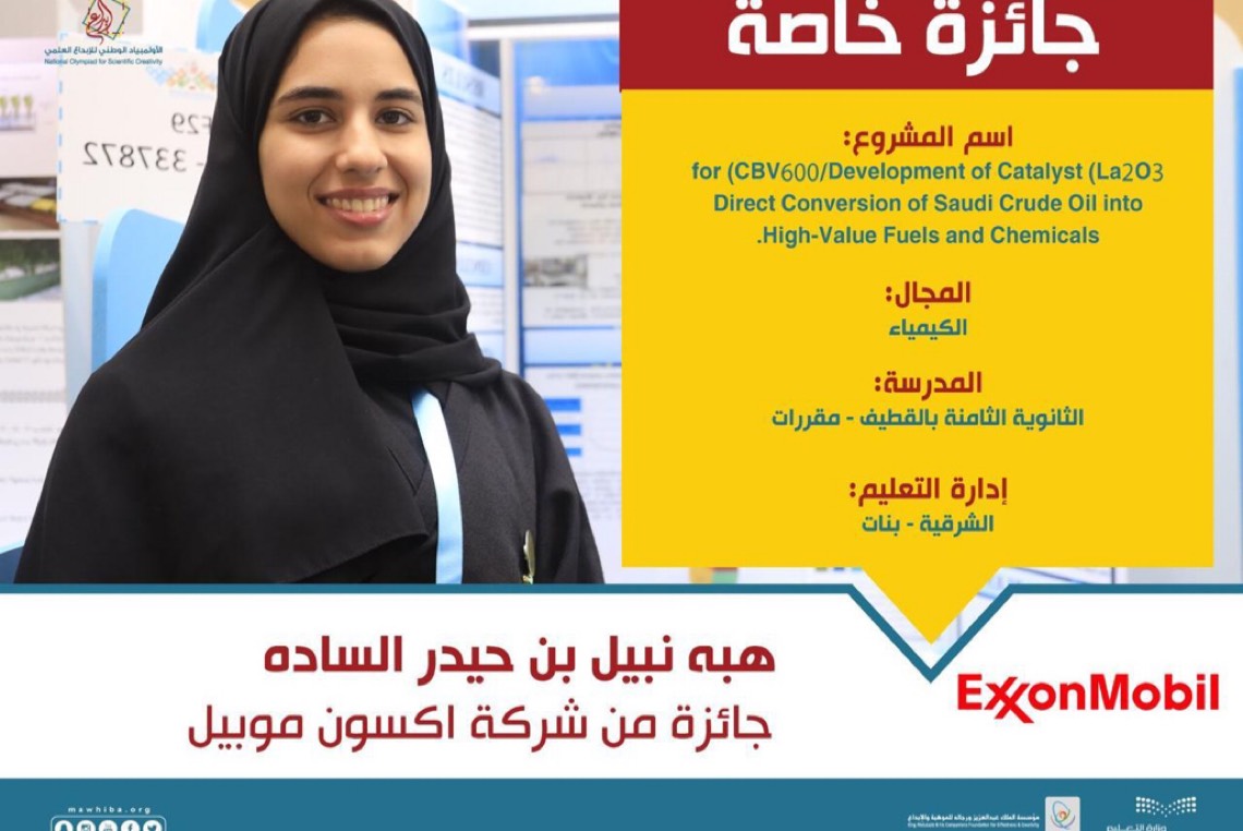 3 - الطالبة هبة بنت نبيل بن حيدر السادة من المدرسة الثانوية الثامنة بالقطيف، جائزة في مجال الكيمياء من شركة «أكسون موبيل» الأمريكية.