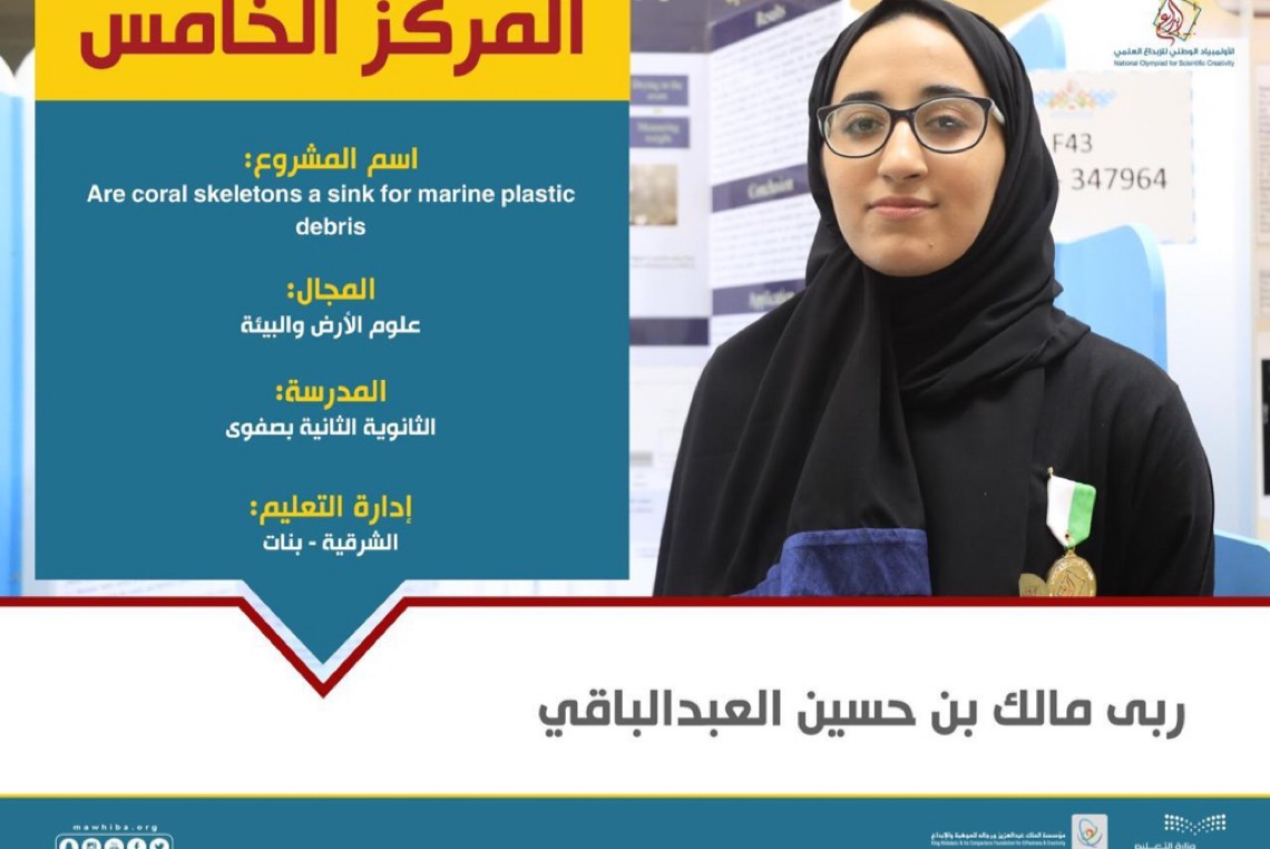 2 - المركز الخامس في مجال علوم الأرض والبيئة للطالبة ربى بنت مالك بن حسين آل عبد الباقي من المدرسة الثانوية الثانية بصفوى.