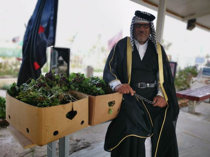 بعبائته السوداء وشماغه المخطط يجلس رجل في الخمسين من عمره عند مدخل مقبرة جزيرة تاروت، وبجانبه ”أعواد الريحان الخضراء“ يوزعها مجانا على وفود الزائرين.