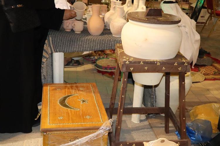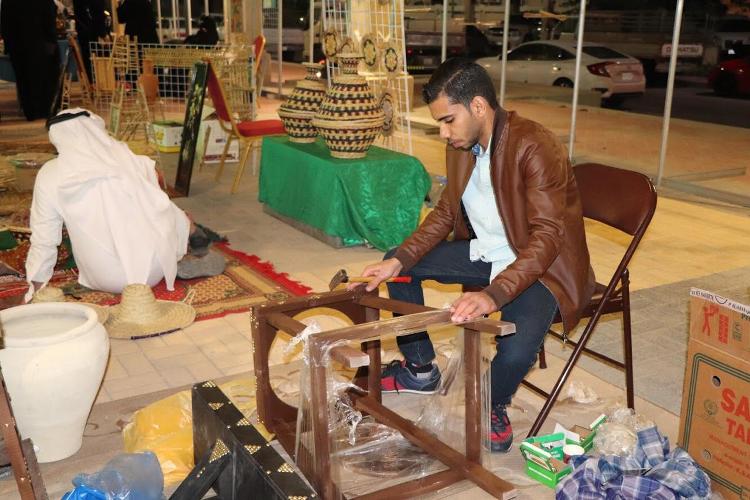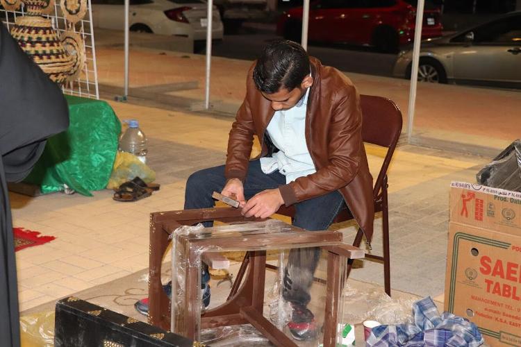 شارك الشاب علي الغراش بركن أعمال النجارة وزخرفة الأبواب الخشبية والنوافذ والصناديق المعتقة، والتي يضيف عليها بعض الرسومات والتطريز وتزيينها بقطع من الجلد والقطع الصغيرة مذهبة اللون.