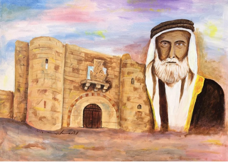 اللوحة التي أنهاها الفنان خلال ساعتين تقريبًا وحملت عنوان ”قلعة العقبة“ جمعت في زواياها قلعة العقبة والملك الشريف حسين بن علي.