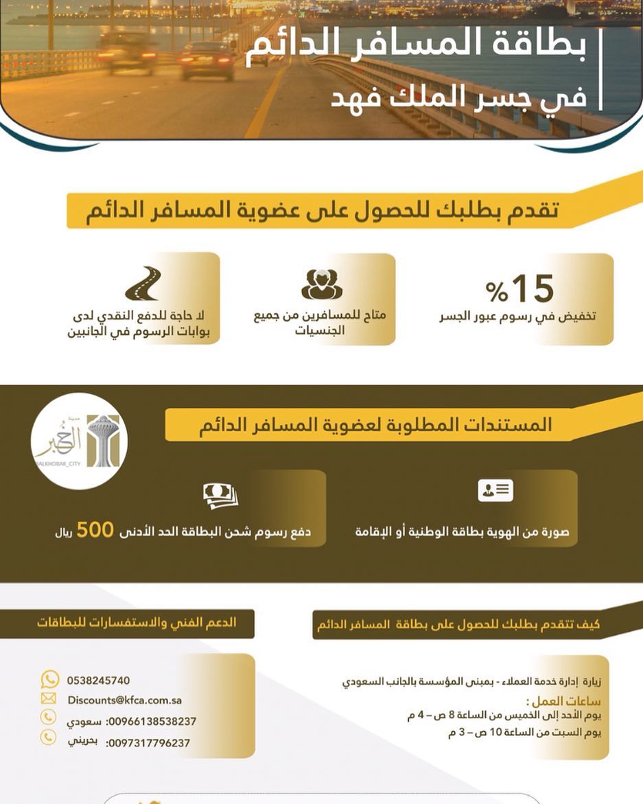 أطلقت المؤسسة العامة لجسر الملك فهد "بطاقة المسافر الدائم" التي تمنح المستفيد تخفيضا بنسبة 15% من رسوم عبور الجسر.