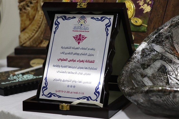يذكر بأن ضيف الشرف في المنتدى محمد الخلفان قام بتكريمها بتقديم درع شكر وتقدير لمشاركة تجربتها الفنية بإقامة معرضا خاصا بأعمالها.