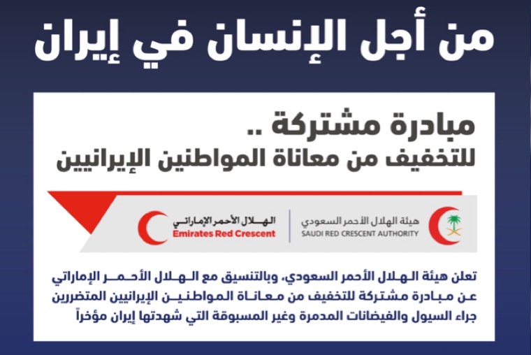 في لفتة انسانية وتحت شعار من أجل الإنسان في ايران، أعلنت هيئة الهلال الأحمر السعودي، بالتنسيق مع هيئة الهلال الأحمر الإماراتي، عن مبادرة مشتركة للتخفيف من معاناة المواطنين الإيرانيين المتضررين جراء السيول والفيضانات المدمرة التي شهدتها إيران مؤخراً.