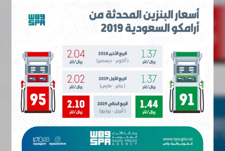 «بنزين 91:1,44 ريال لكل لتر»، و«بنزين 95:2,10 ريال لكل لتر»، وذلك خلال الربع الحالي أبريل يونيو 2019م.