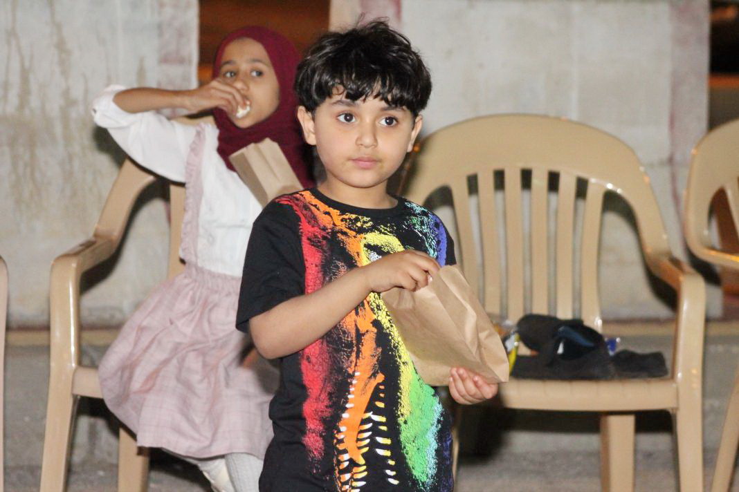 وردد الاطفال حاملين أكياس مزكرشة، وحلويات ملونة، هتافات وأهازيج ب «ناصفة حلاوة.. عطونا الله يعطيكم.. سلم الله أبو عيالكم». فيما حرصت الأمهات على توزيع الحلوى عند أبواب منازلهن.