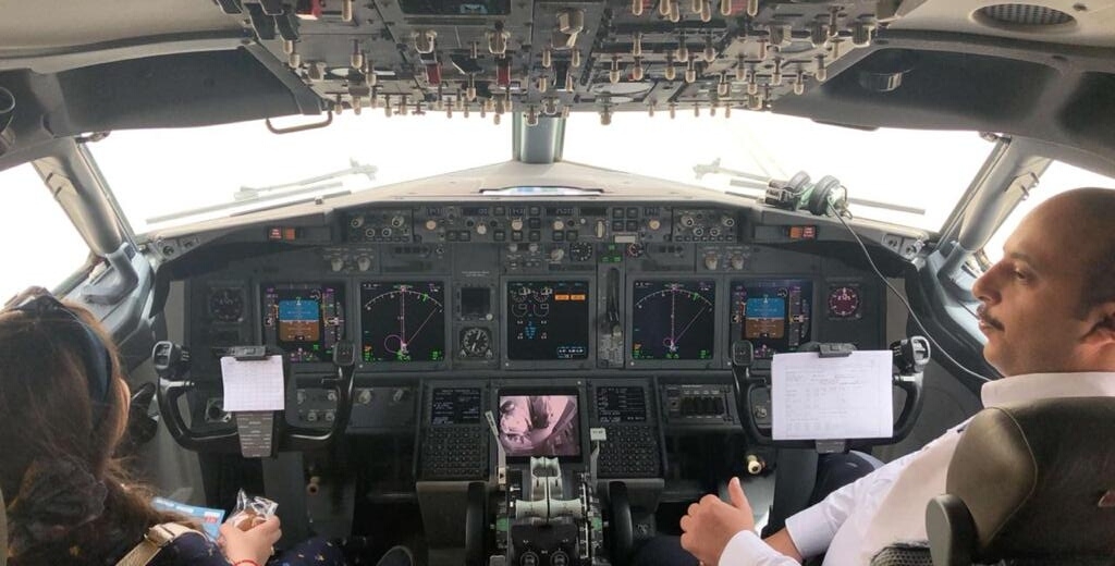كما تم شرح كيفيه قيادة الطائرة من قبل الكابتن فهد الخالدي وتعرفن على سبب ظهور مسارات بيضاء أثناء الطيران وخروج الهواء من المحركات والرد على استفسارات الطالبات الموجهه إليه.