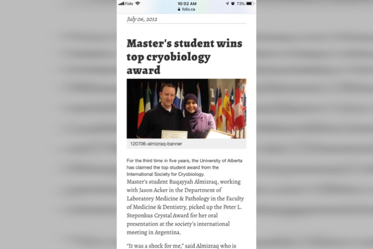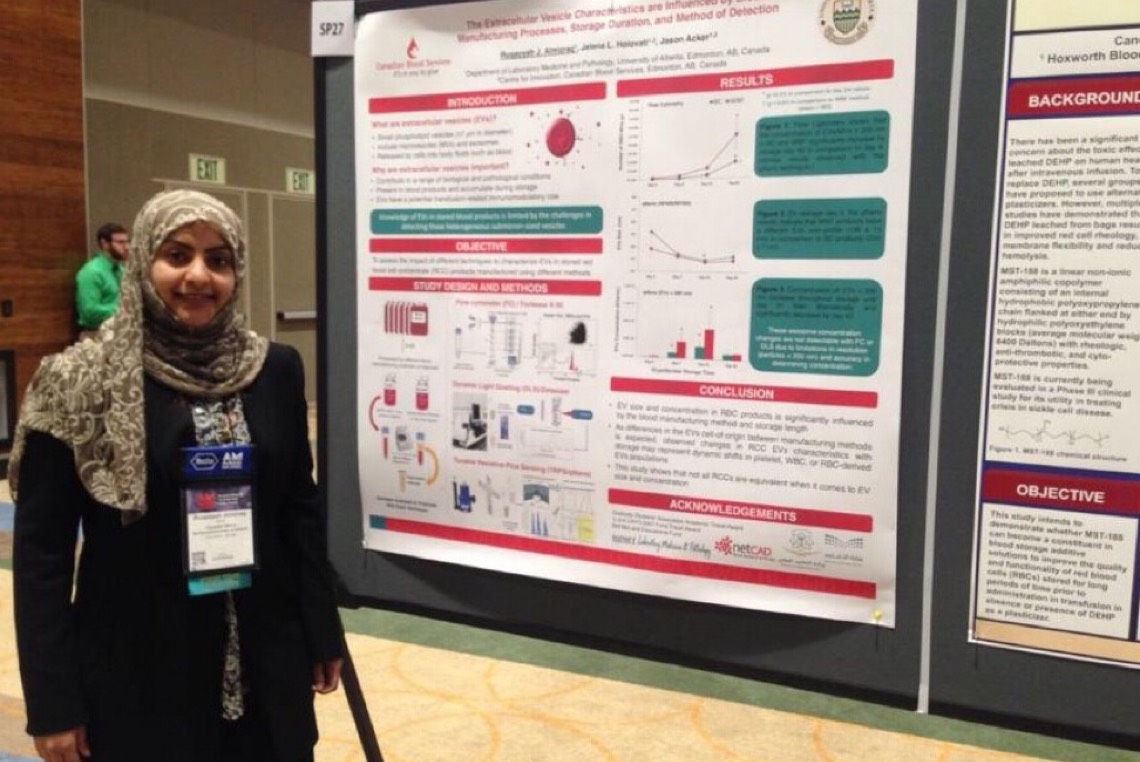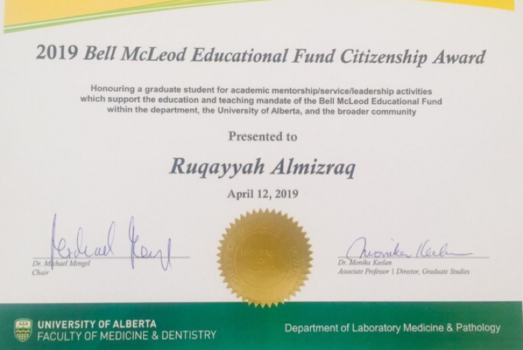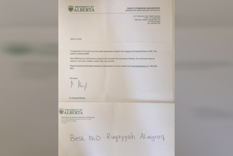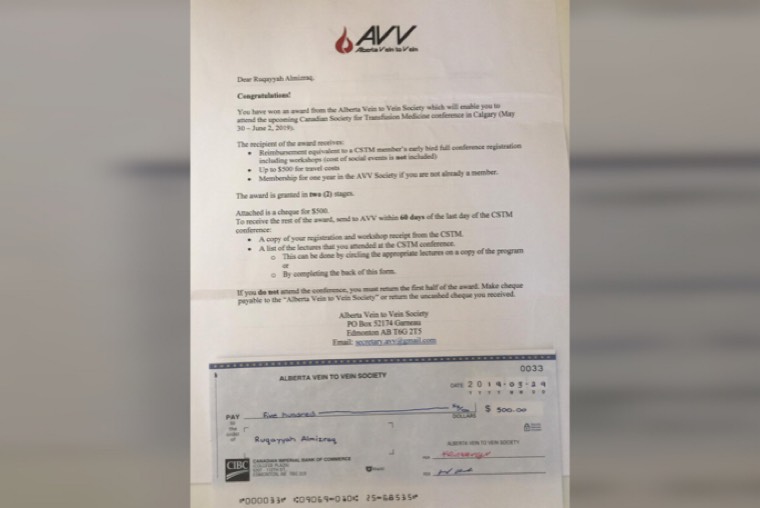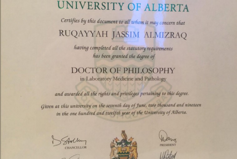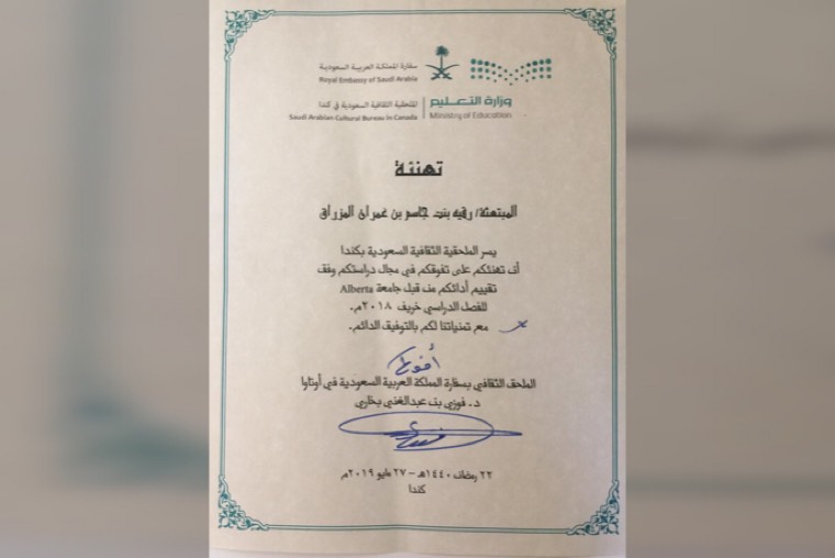 ”مناقشة الرسالة قبل العودة للوطن“ كان هو الحل الوحيد للتخرج من الدكتوراه الفلسفية، ولترفع رقية المزراق اسم الوطن عاليًا بتقديم بحثها ضمن افضل بحثين حسب تصنيف الجمعية الكنديه لنقل الدم CSTM شاكرة جميع من ساندها ومنهم البروفيسور ”جيسن اكر“ ومعالي الوزير الدكتور خالد العنقري الذي قال لها ذات يوم ”الوزارة تفتح أذرعها للطلاب المتميزين“ في ملتقى تخرج المبتعثين اثناء عرضها له بحث رساله الماجستير.