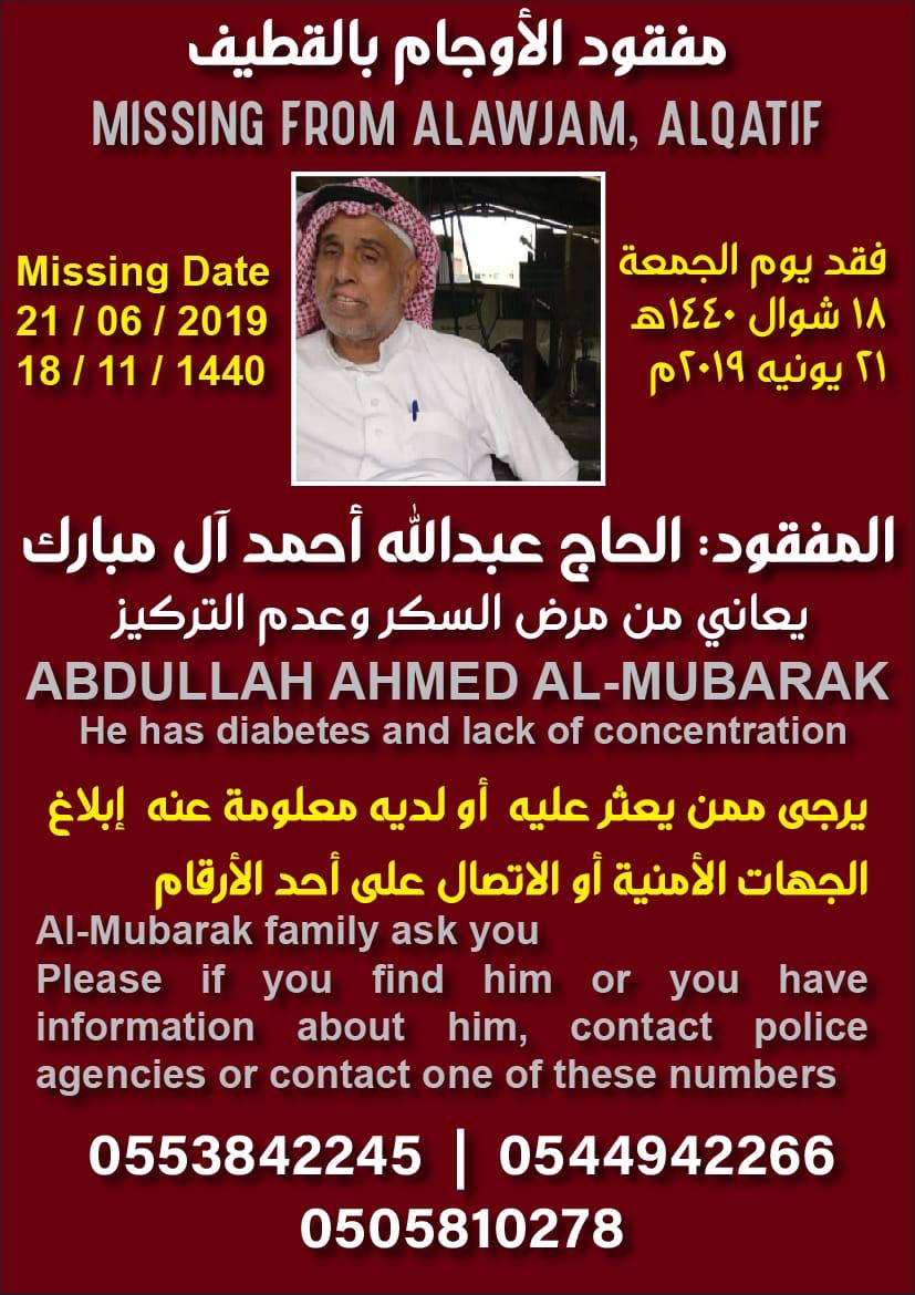 ناشد ذوو الحاج عبدالله أحمد آل مبارك بمساعدتهم في البحث عن مفقودهم الذي توارى عن الأنظار منذ خروجه صباح اليوم الجمعة.