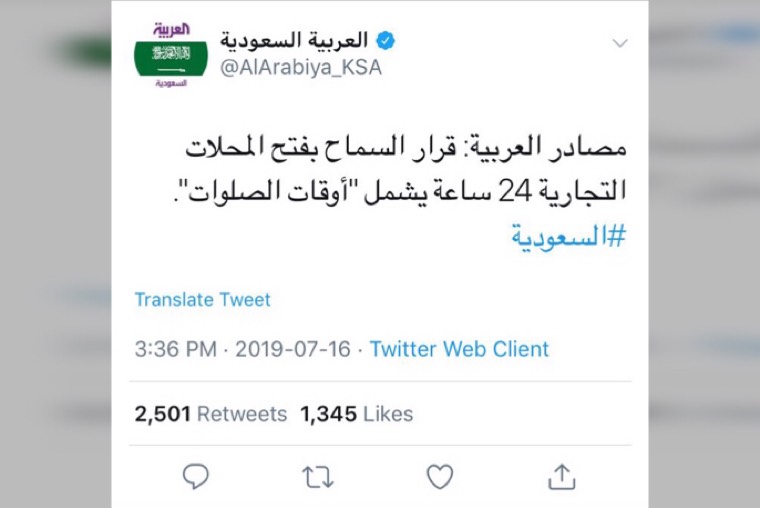 ونسبت قناة العربية لمصادرها القول بأن قرار السماح بفتح المحلات التجارية 24 ساعة يشمل ”أوقات الصلوات“.