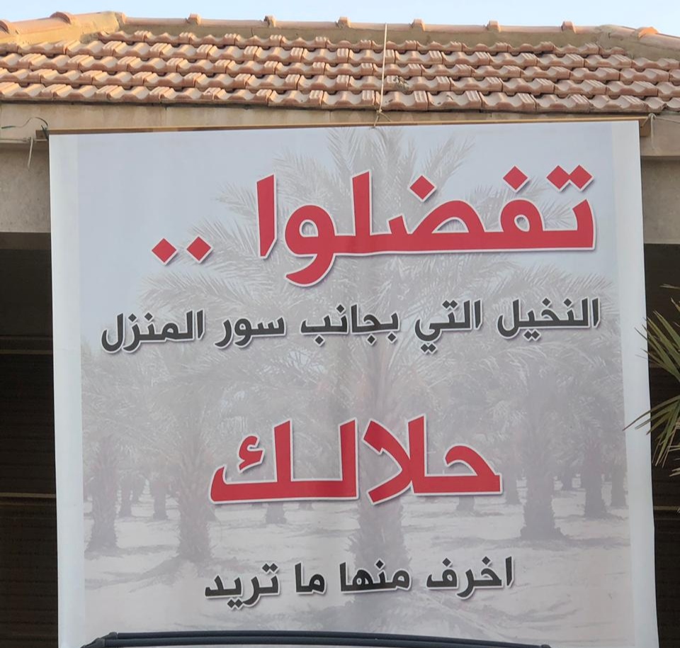 وعلّق السيد هاشم الشرفا لافتة قبال منزله في حي الطرازية رحب فيها بالمارة ويدعوهم لـ ”خرف“ الرطب من 17 نخلة زرعها في محيط منزله.