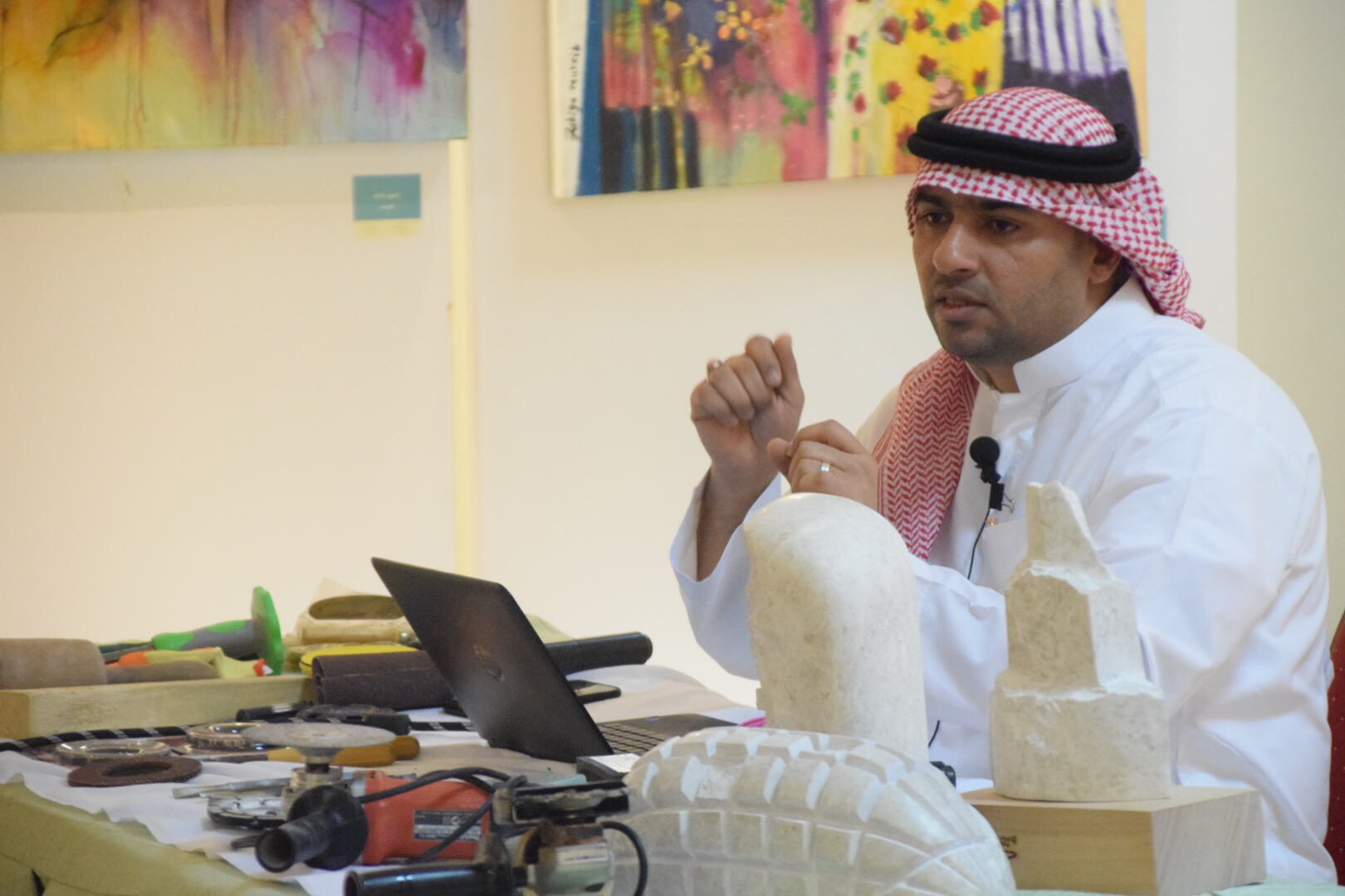 كما تضمن جلسة حوارية بعنوان «فن النحت» تضمنت تجربة نحتية يتحدث من خلالها التشكيلي حيدر العلوي عن تجربته التي واجهته كنحات، بهدف إثراء جميع الجوانب الفنية لدى الفنانين.