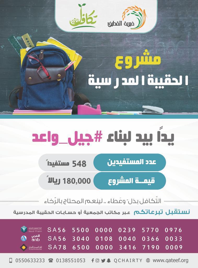اطلقت خيرية القطيف صباح الأربعاء مشروع الحقيبة المدرسية استعدادًا للعام الدراسي الجديد تحت شعار يدًا بيد لبناء جيل واعد، والذي يستهدف 548 طالبًا وطالبة من أبناء الأسر المستفيدة.