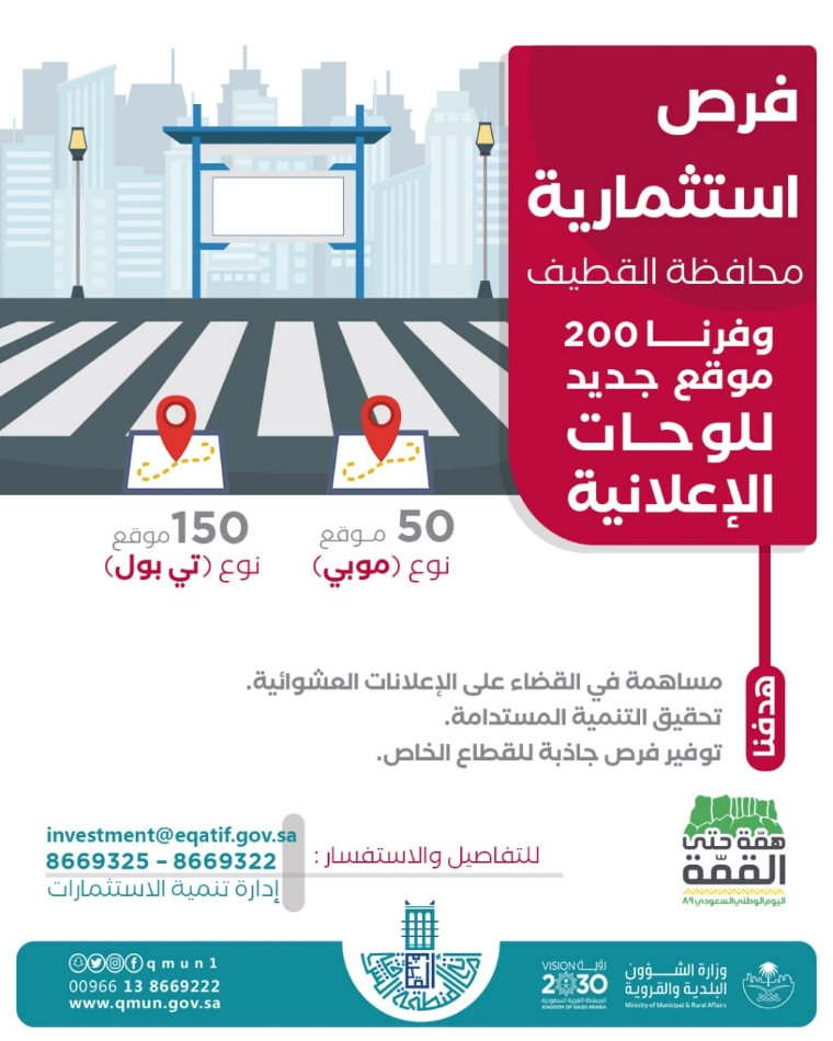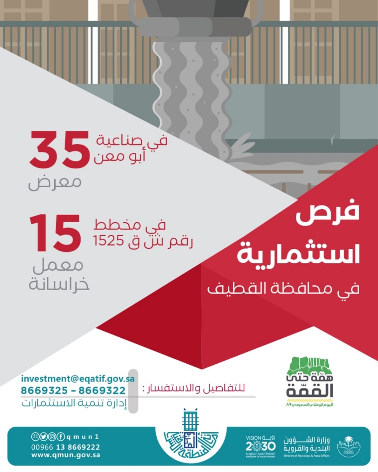 ودعا الراغبين في الاستثمار أو الاستفسار التواصل عبر البريد الالكتروني لإدارة تنمية الاستثمارات «investment@eqatif. gov. sa» او التواصل عبر الارقام: 8669322 - 8669325