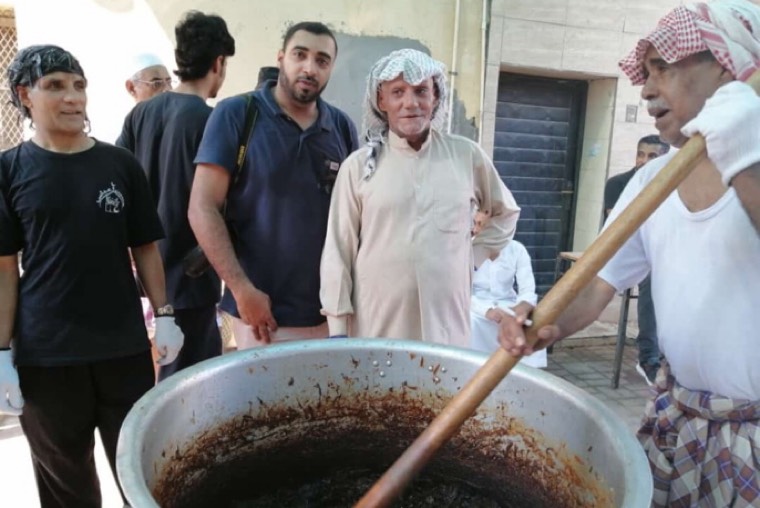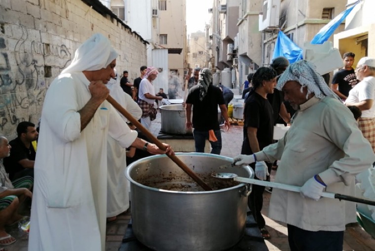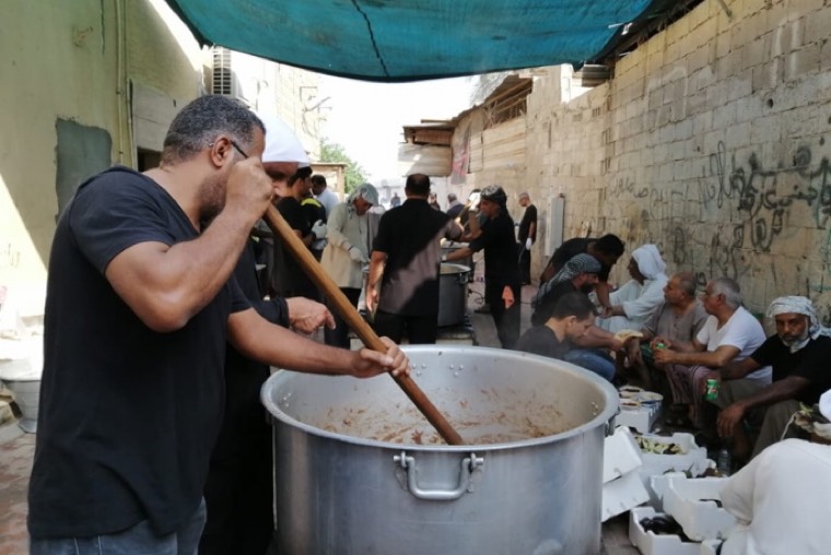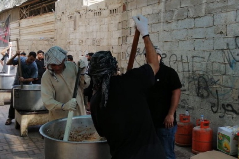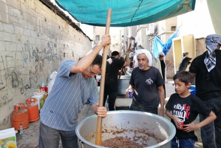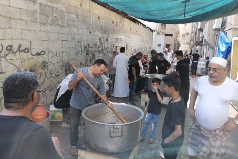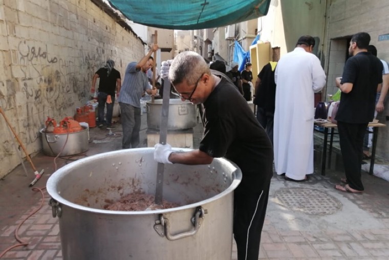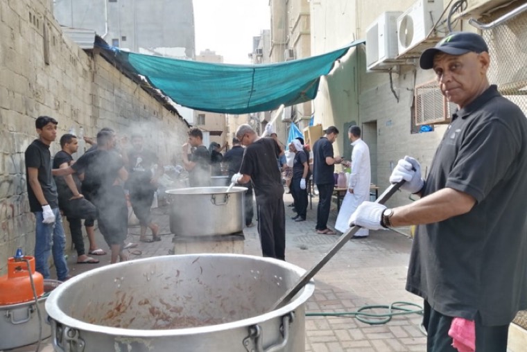 منذ ساعات الصباح الباكر، يبدأ العاملون في مأتم ”آل سويد“ بتجهيز وطهي الأطعمة لتوزيعها على روّاد المأتم وأهالي الحي بمسمى ”بركة“ ذكرى وفاة النبي.