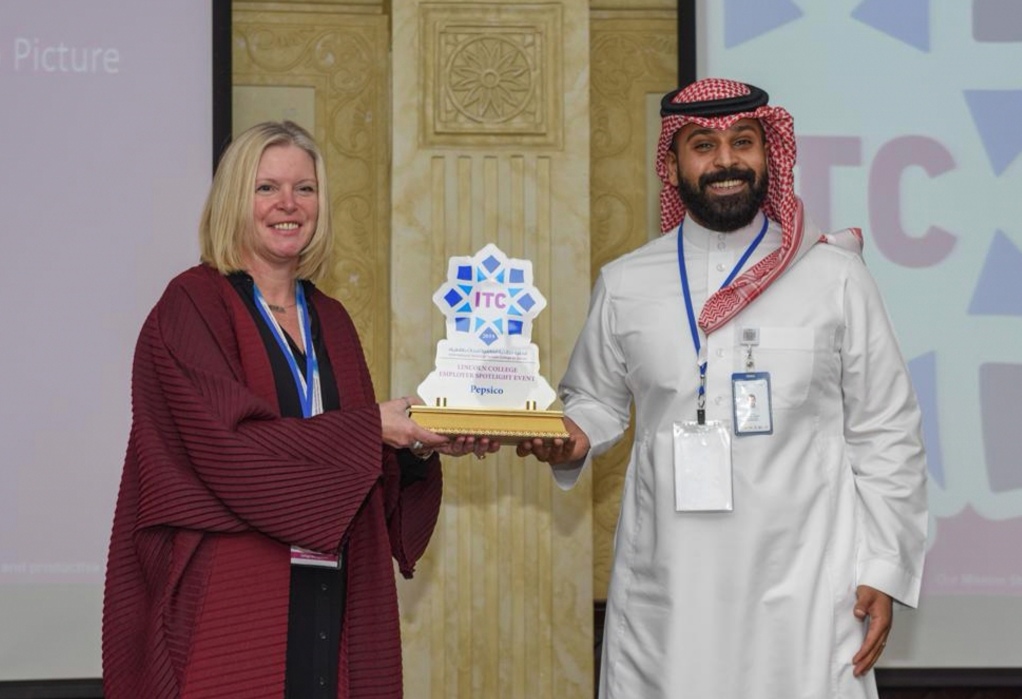 وذلك في الحفل المقام في قاعة فندق الهيلتون في الظهران وبحضور عميدة الكلية جين لورد، وممثلي الشركاء.